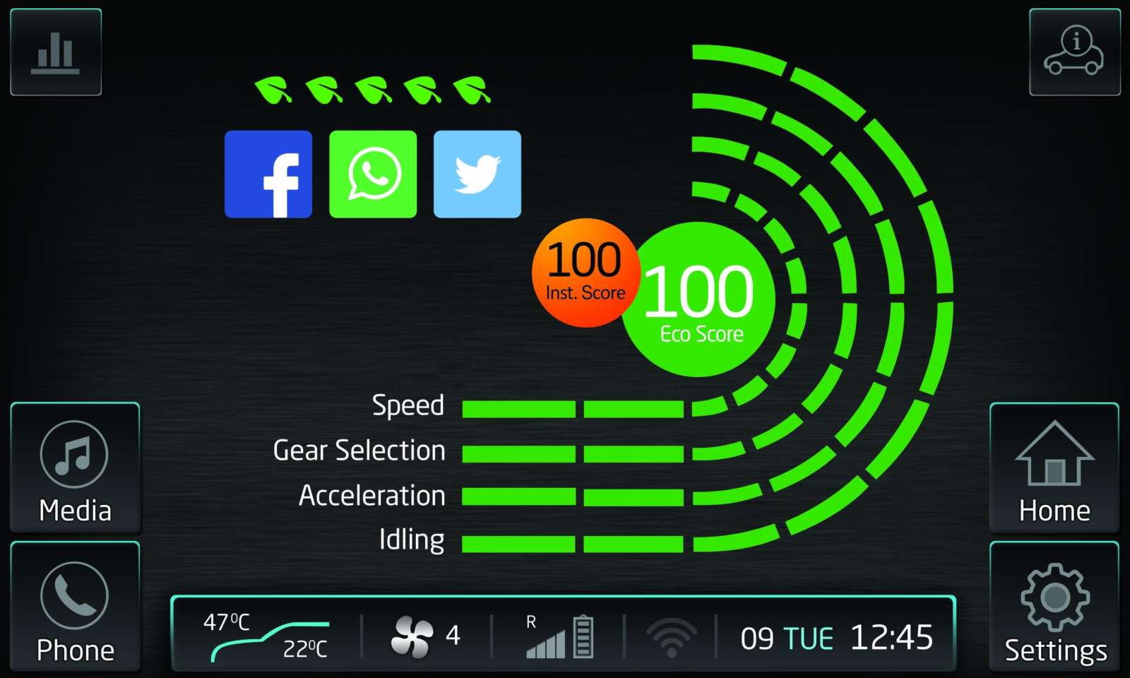 - Ecosense – An industry first by Mahindra, Ecosense Technology helps in optimizing fuel consumption and reduces CO2 emissions by assisting the driver in driving more efficiently. For every trip, the user gets an Ecoscore out of 100, based on driving parameters like – speed, gear selection, acceleration, idling, clutch override and aggressive breaking. During the trip, the infotainment system keeps displaying an instantaneous Ecoscore and an average Ecoscore. Ecosense Technology allows the user to share his/her Ecoscore on social media platforms like Facebook, Twitter and WhatsApp. The user gets easy access to the Ecosense data and history on the infotainment system as well as on the Bluesense app and the With You Hamesha website.