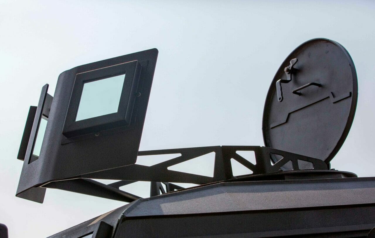 To move all that mass, powering this mean-looking Mahindra is an 8-cylinder 4.5-litre turbodiesel engine which cranks out 195 Hp @ 3,500 rpm and 430 Nm of torque between 1200-3200 rpm. All that power is routed to all the four wheels via a 5-speed manual gearbox, allowing the driver to be in complete control of the vehicle. Standard kit on the ASV includes power steering, CEN B6 protection, Fit for Radio (FFR), multi-layered ballistic glass, engine & battery protection, run-flat system (as per finabel 50km), protected fuel tank, roof hatch with 360 °, fire extinguisher, intercom system, siren, public address system and additional water/fuel storage cans.