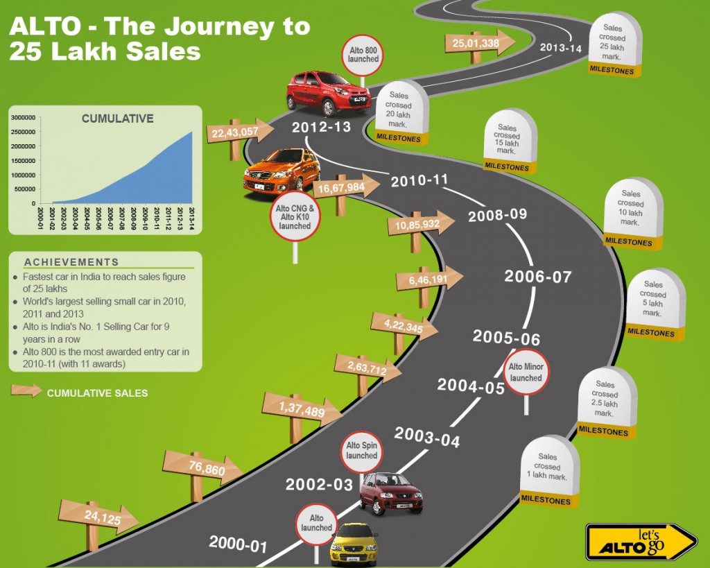 It has emerged that Maruti Alto sales have crossed the cumulative 25 lakh mark (2.5 million). The Alto brand of cars was introduced in India way back at the commencement of the new millennium, when the car was brought to India in both an 800cc and a 1.1 litre engine variant. Since then, Maruti Suzuki India Ltd (MSIL), the nation’s largest selling car maker has sold more than 25 lakhs units of this model in Indian and export markets. Currently, the Alto brand comprises of two models in India — the Maruti Alto 800 and the Maruti Alto K10.