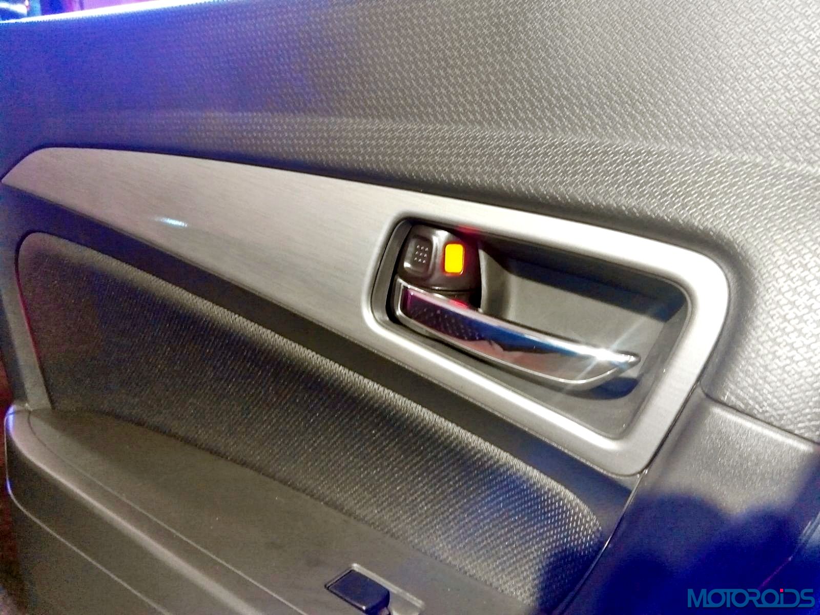 Rugged door grab handle with continued accentuation from the instrument panel extends the ruggedness of the SUV to the interiors.