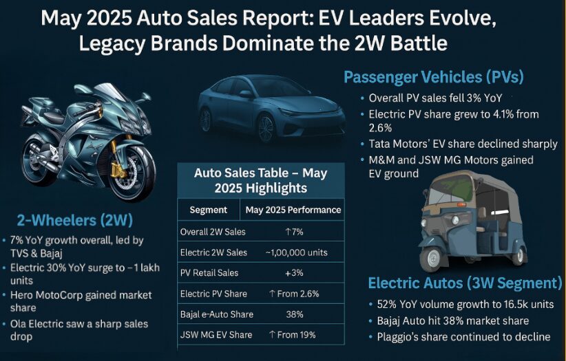 May 2025 has been a mixed bag for India’s automobile industry. From a modest surge in 2-wheeler sales during the northern wedding season to electric vehicles gaining serious traction, the month signals a deepening shift towards electrification. While legacy giants like TVS and Bajaj Auto continue to rule the electric 2-wheeler space, the passenger EV segment is now buzzing with new frontrunners like JSW MG and Mahindra.