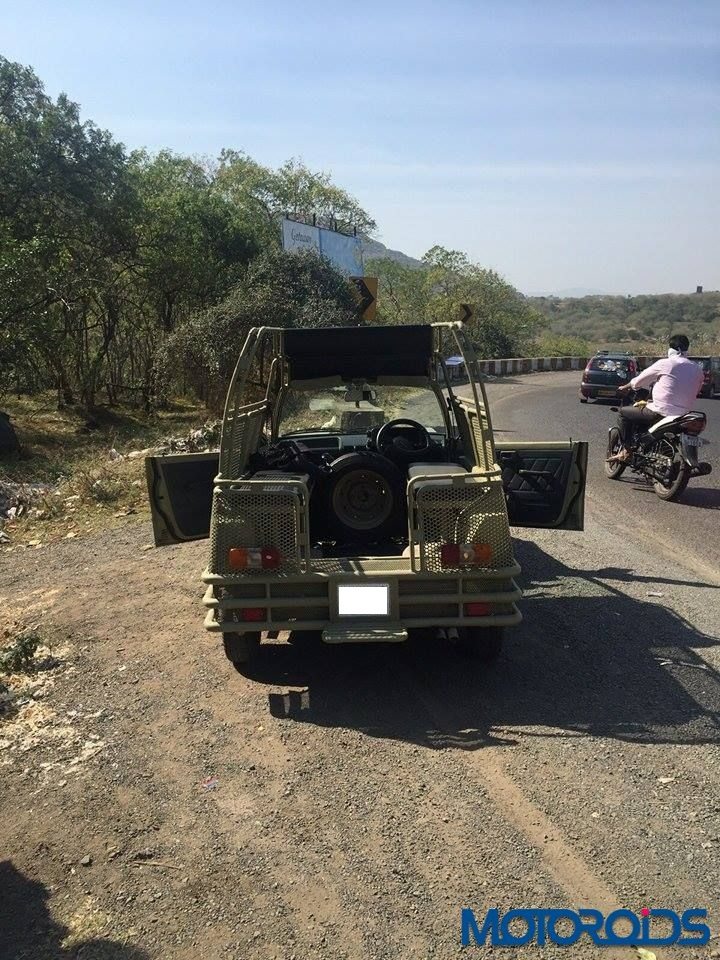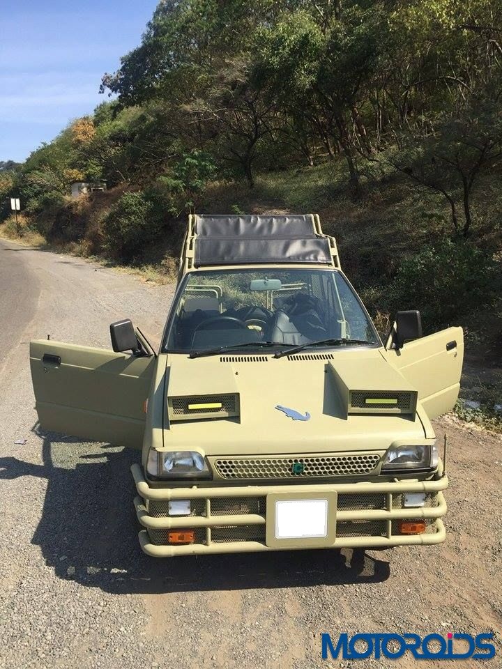 Talking about the exteriors, the car has been horizontally cut into half with the Gypsy’s body taking the rear side. A four door setup makes way for a 2 door layout with the rear doors being removed. Pillars though, are installed near the doors to keep the strength of the chassis intact. The car features headlamps shades, tail lights that seem to be taken from a commercial vehicle and dual bonnet extensions (non-functional).