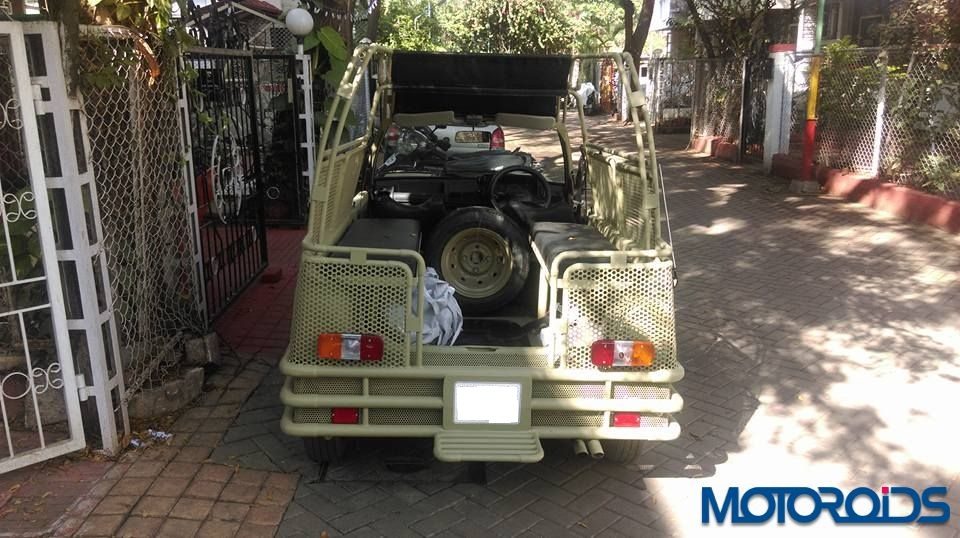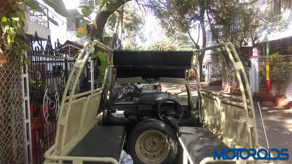 Coming to the interiors of the car, the first row features the conventional two seat setup albeit a bit smaller in size. Replacing the 3 seat bench in the second row are two bench seats that increase the seating capacity of the car to a total of six. The roof of the car has been chopped off and makes way for some custom frames. Sitting between the front and the rear seat setup is the spare tyre of the car.