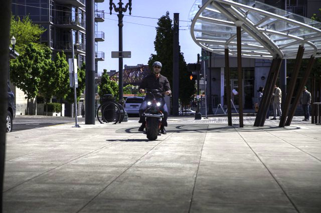 Hoffman says “Segway is too big to use in offices and buildings. It takes up a lot of floor space, too, and it puts its riders head and shoulders above everyone else – that’s why the RYNO works. I don’t take up much more room than I normally would just standing here. I’m standing flat on my feet, with the bike between my legs, and I’m at the same eye level as the other people in the elevator, not towering above them. That’s the key.”