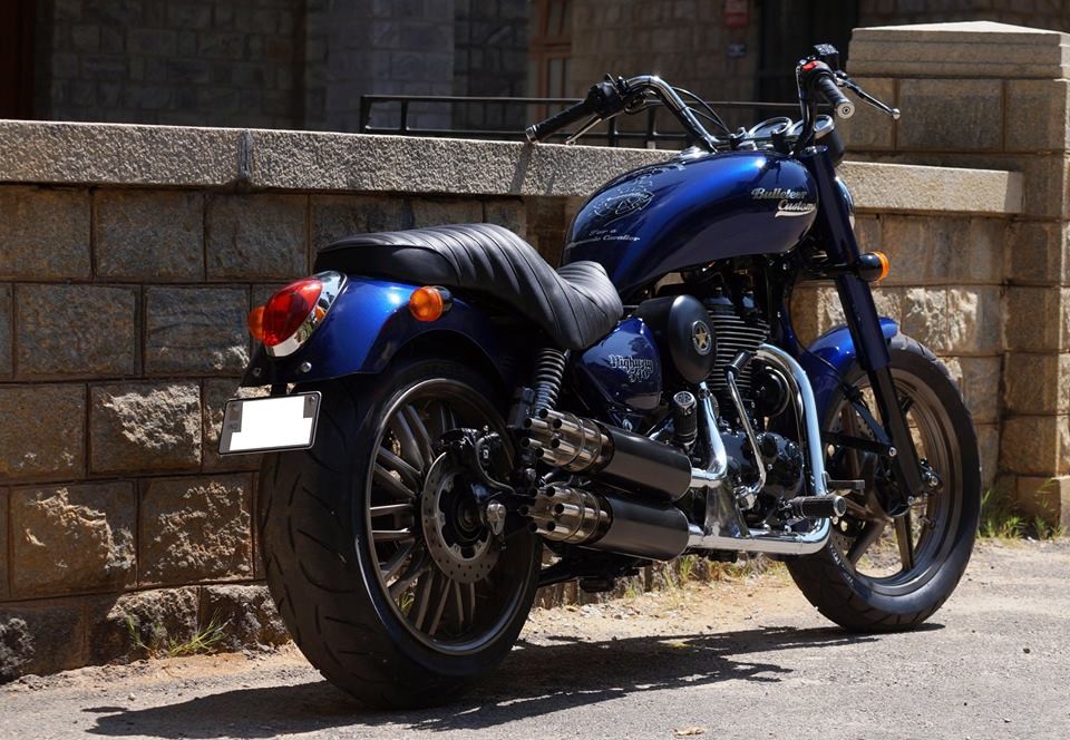 The motorcycle rides on a relatively wider 190mm rear tyre which is wrapped in a custom, multispoke alloy wheel. The front five spoke wheel, however, looks pretty basic. The dual Gatling gun exhausts standout although one of the two units seems to be present to add aesthetic value only. Another feature that deserves a special mention is that massive seat on the custom motorcycle which is claimed to be one of the most comfortable units from the aftermarket. Further enhancing the aesthetics is the custom made fuel tank which has been made from scratch. The Deep Sea Blue paint job highlight the submarine/sea theme.