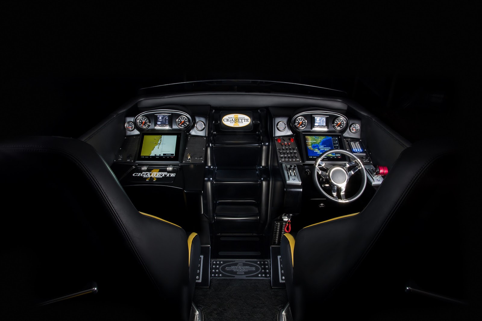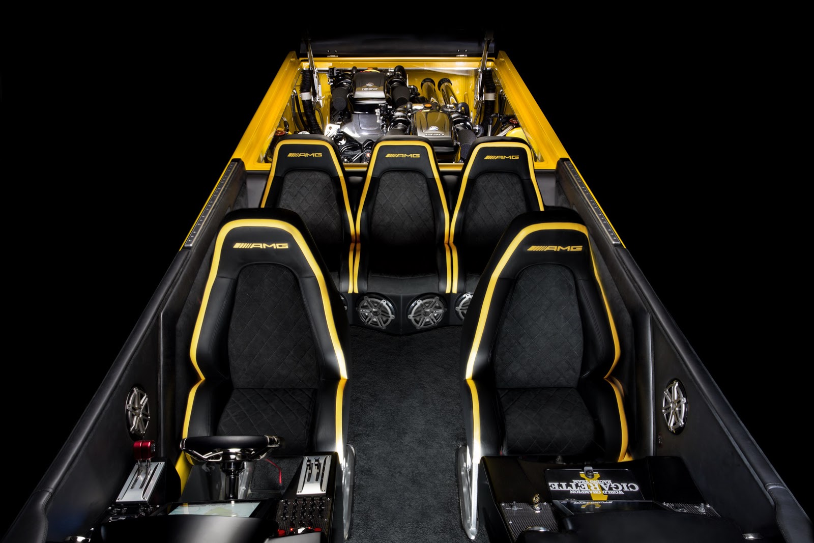 Finished in matte black with Solarbeam highlights on the hull, the boat also has prominent AMG logos plastered to the its sides. The interiors have the same colors, and can seat five in AMG branded seats. Other bells and whistles include Bluetooth communication, computer-based control, four high-resolution displays, Garmin and Cigarette navigation, and an audio system.