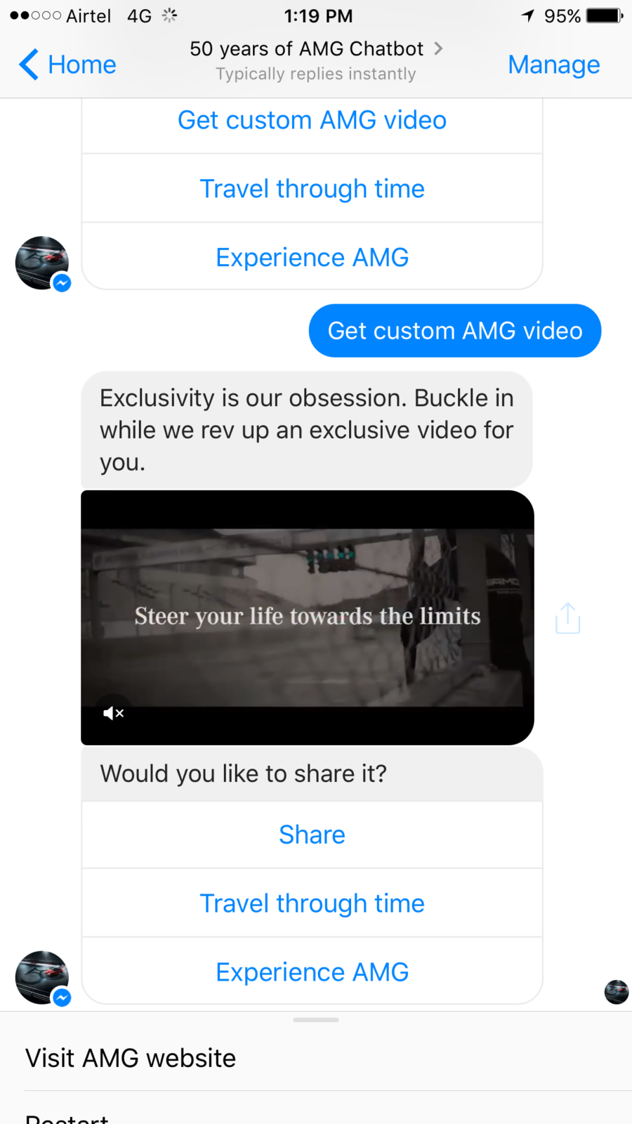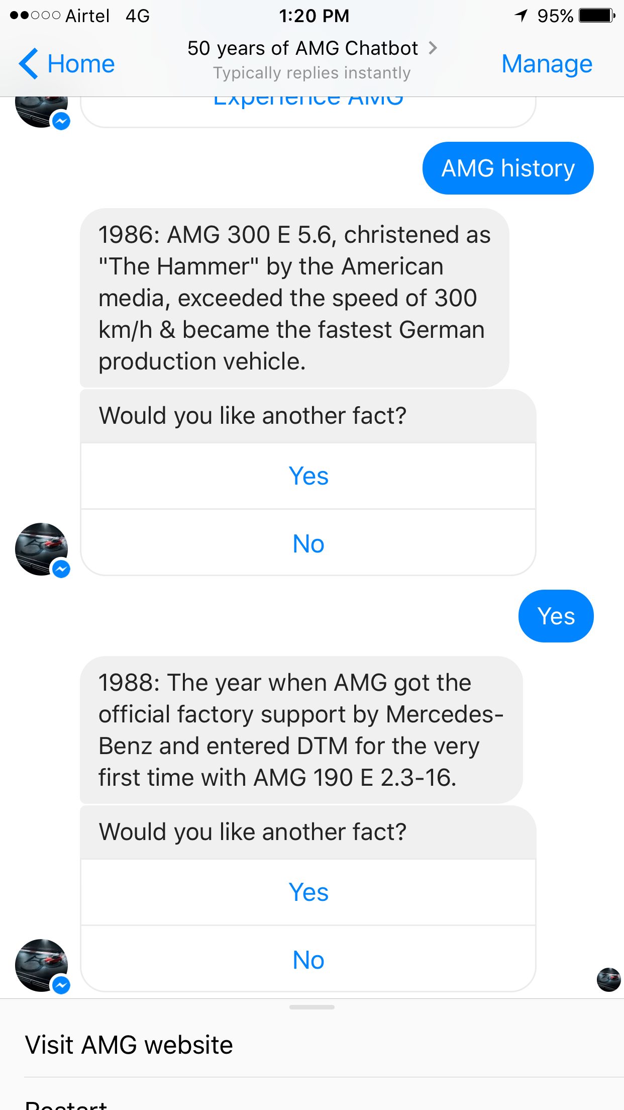 Mercedes-Benz became the first ever automobile brand in India to launch a Facebook Messenger chatbot to commemorate 50 years of AMG. AMG has had a history of many firsts and they took this one step further with the 50 years of AMGChatbot. Built by digital agency, alivenow in collaboration with media agency MEC, the chatbot was launched earlier this week with hundreds of users already interacting with it.
