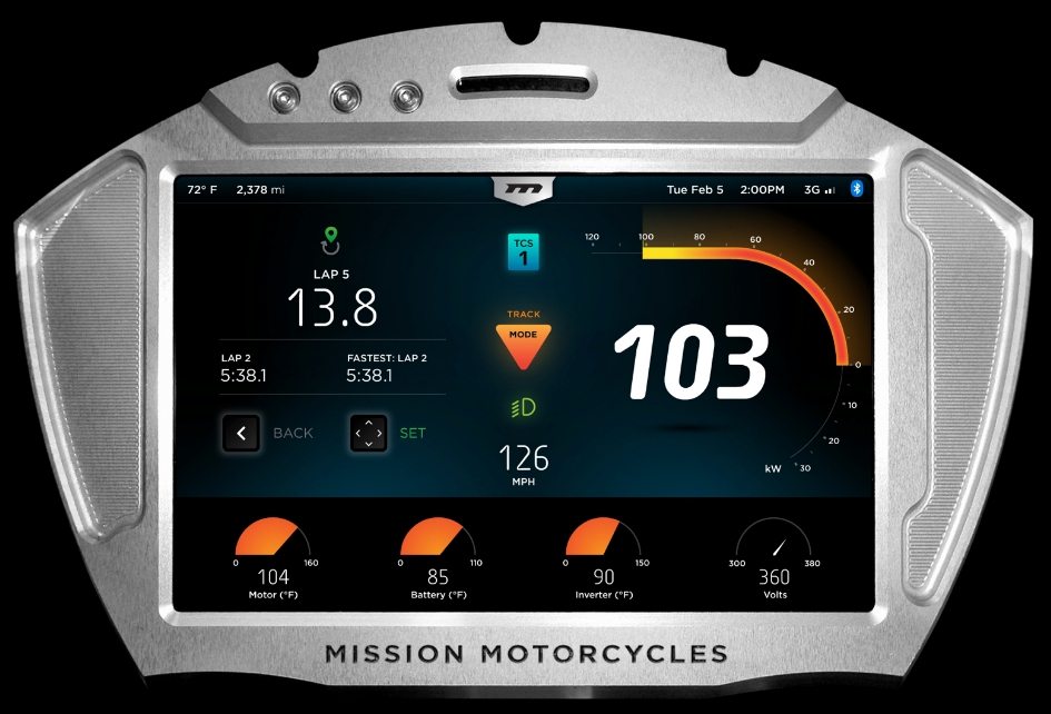 Also the two motorcycles feature MissionOS which is a cellular-data enabled, high resolution, pressure-sensitive touch screen based UI that supports integrated GPS, Bluetooth, an integrated image-stabilized HD camera, and head-up display (HUD) integration. It also provides turn-by-turn GPS navigation, communications, controls, track mode, and ride telemetry data with the OS that can be updated on the move.