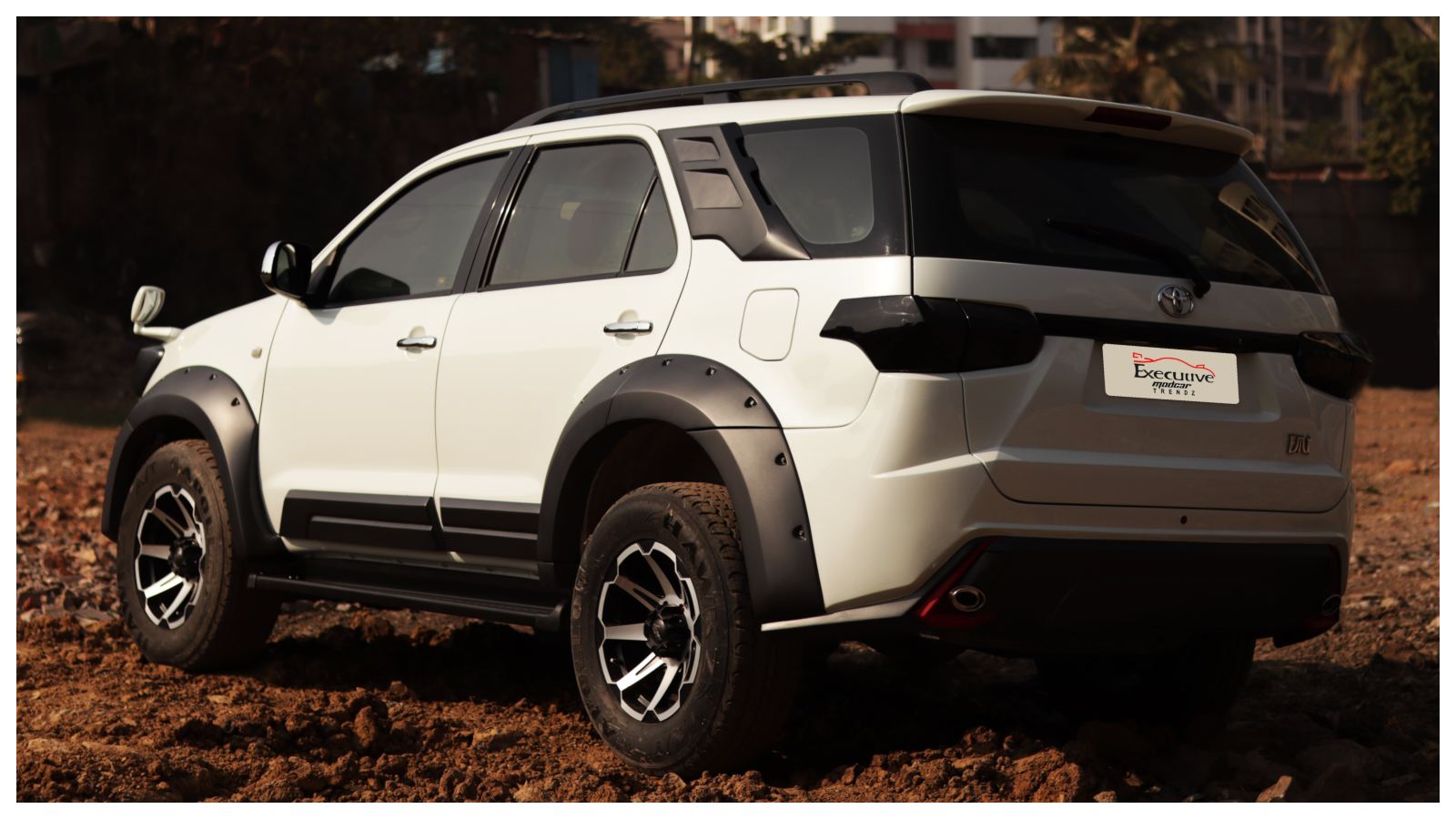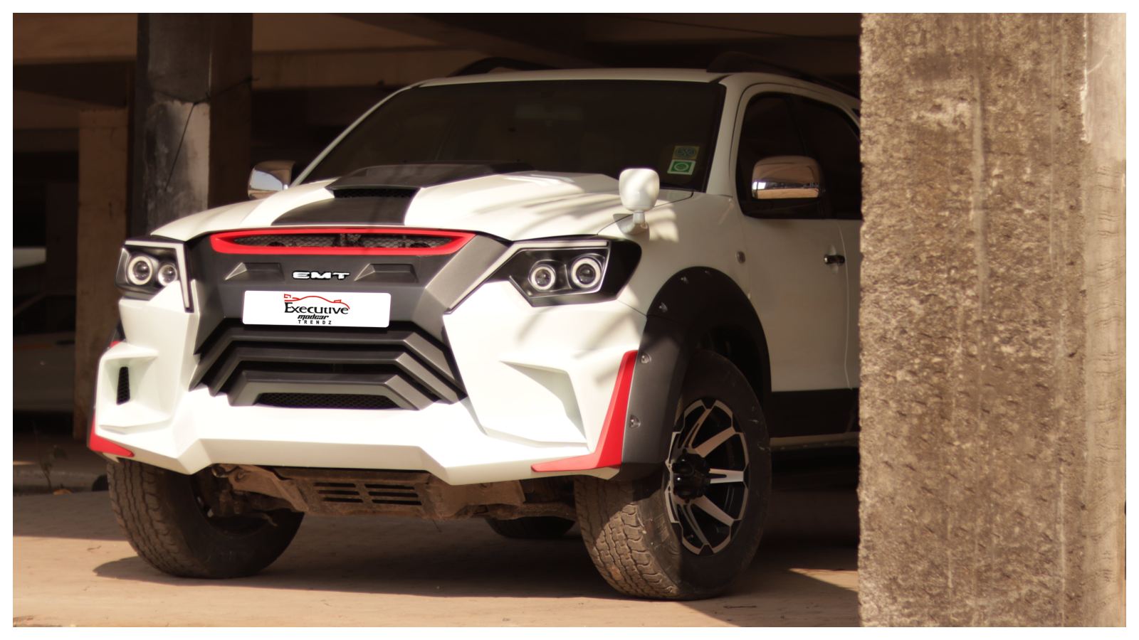 In terms of design, this Toyota Fortuner is probably the sportiest of them all. Even though the mechanical components of the car are not interfered with, the suspension is still tweaked to match up to the new, wider and bigger 18-inch rims which are fitted with Apollo Hawk All-terrain tyres. The bigger wheel arches are fitted with bolted fenders, to give the car a tough look. The front and rear bumpers are completely redesigned to add black accents and enhance the tough off-road look. The Fortuner also gets a fully customized look on the front grille and bumper, which makes the car look futuristic and sporty at the same time. A neat bash plate below the front bumper protects the engine from unwanted shocks and jerks and makes the car off-road ready.
