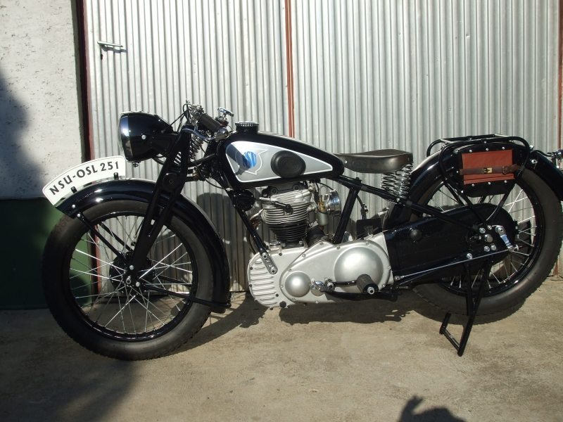 The motorcycle is a 1938 NSU 251-OSL manufactured by NSU Motorenwerke, an 1873 founded German manufacturer then into production of automobiles, motorcycles and bicycles. Having numerous speed records to its name including a 200+ mph run at the Bonneville Salt Flats way back in 1956. Later acquired by Volkswagen in 1969, it was merged with the Auto Union which we know by the brand Audi today.