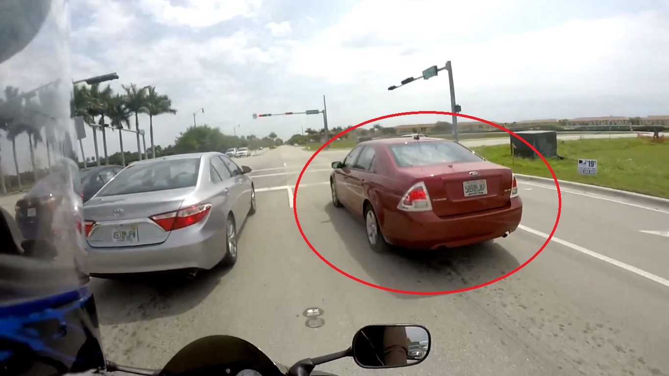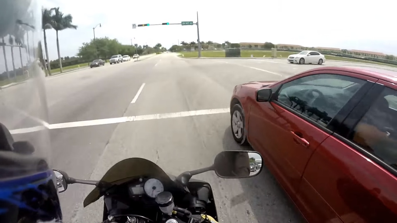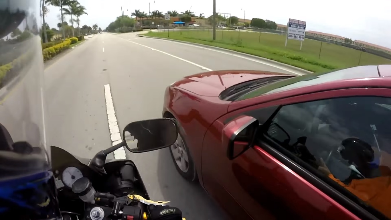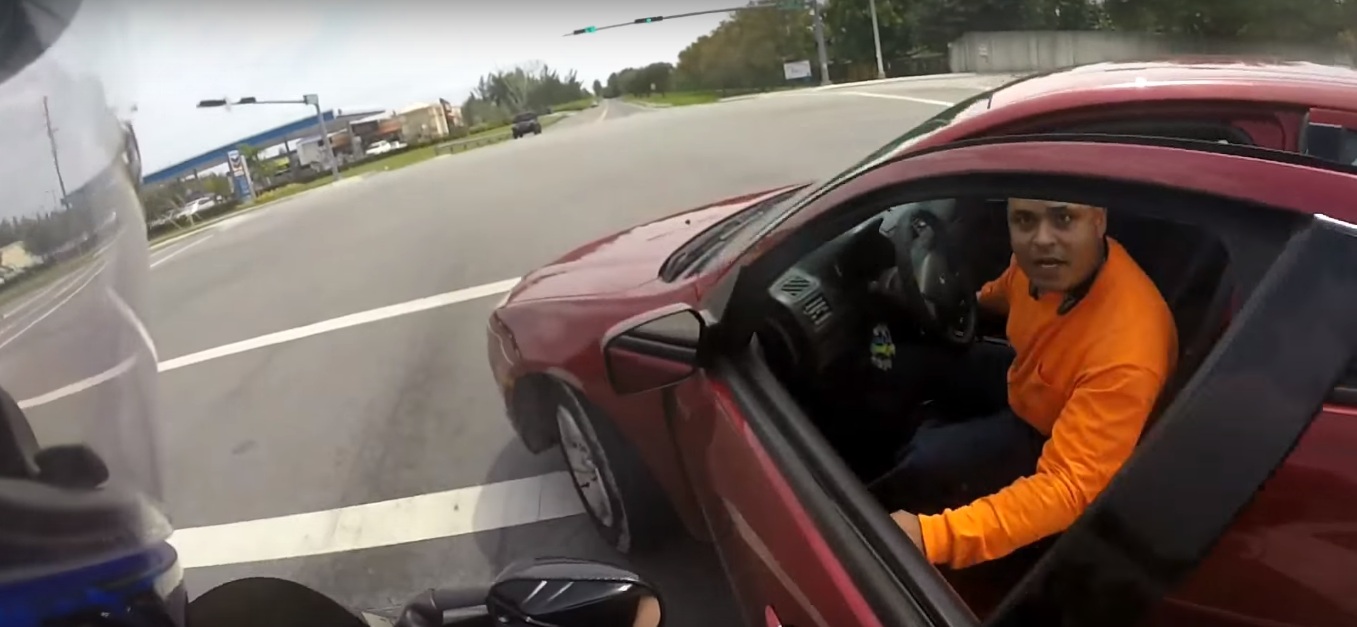 Update: As reported by Local10, both, the motorcyclist and the car driver have been arrested. Rone Gonzalez, the 23-year-old motorcyclist is charged with reckless driving while the car driver, Kristian Rosa, 30, is charged with felony Aggravated Assault with a motor vehicle along with misdemeanor reckless driving.
