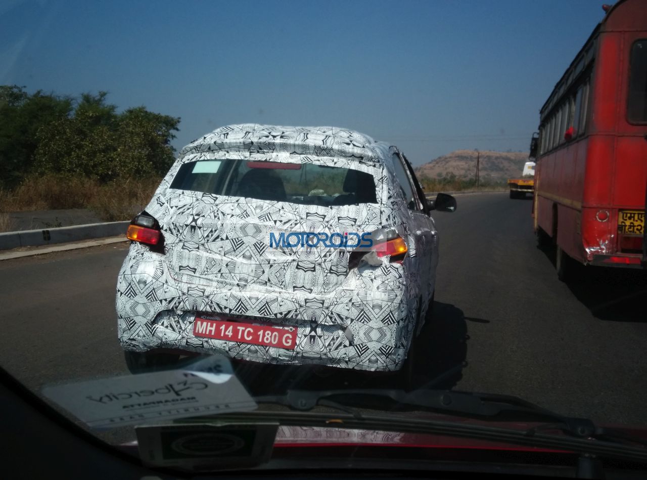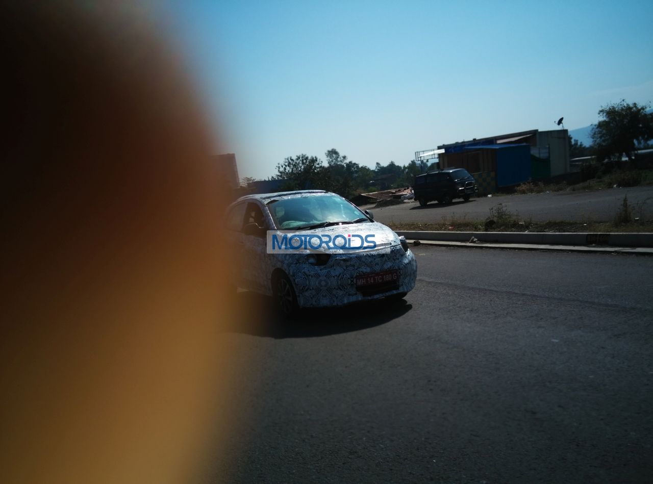A test mule of Tata’s upcoming hatchback, the Kite, was again spotted doing the test runs near Pune. Avid Motoroids reader and follower Bhupendra Bhavsar photographed the prototype on the outskirts of Pune. The test mules reveal a few more details about the car. To begin with, the prototype does not get body coloured rear-view mirrors. Braking department will see non-ventilated disc brakes at the front while a set of drums brakes are expected to perform the stopping duty at the rear. Diamond-cut eight-wheel alloy wheels can also be seen at the front.