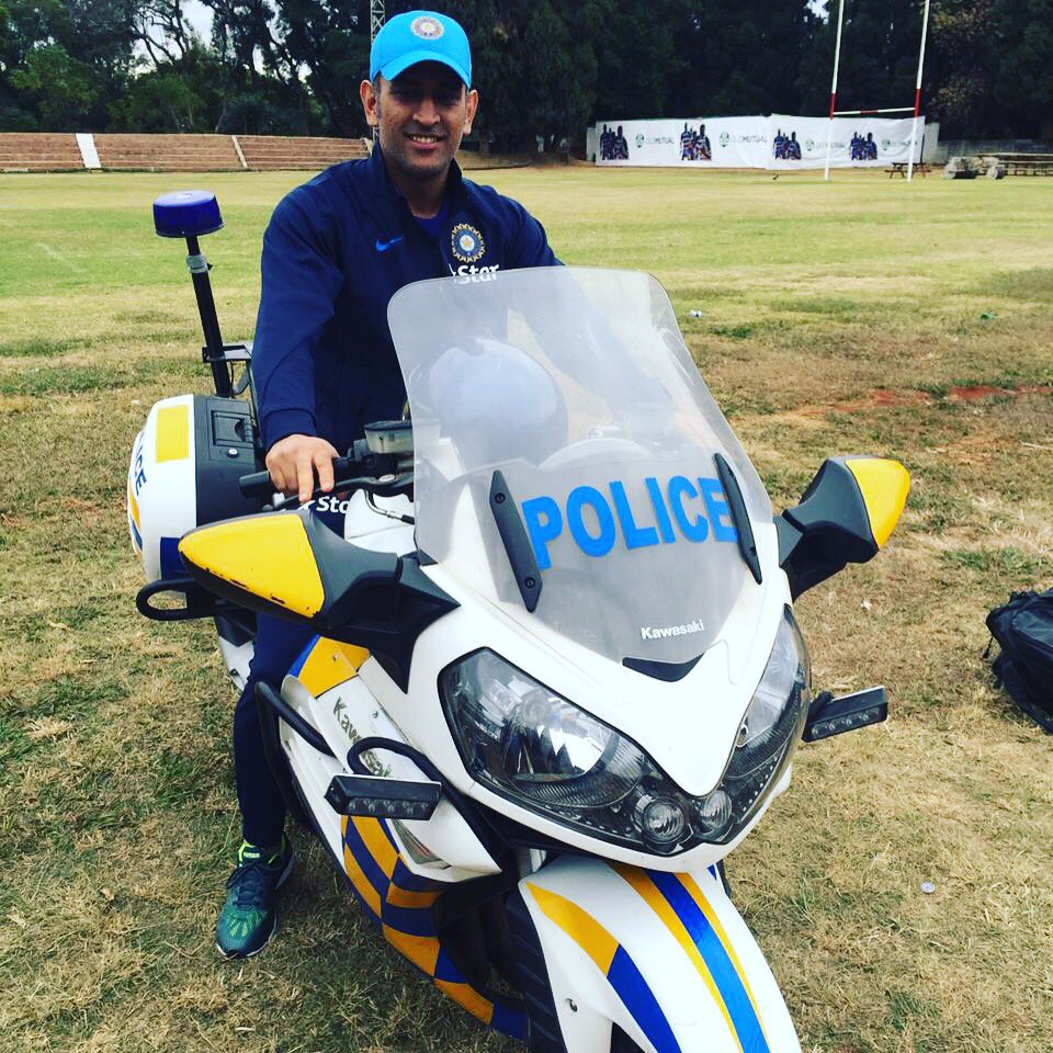 Zimbabwe has got a new cop. #TeamIndia captain @msdhoni about to ride a Kawasaki Contours 14 ABS pic.twitter.com/IZQIg2Cobf