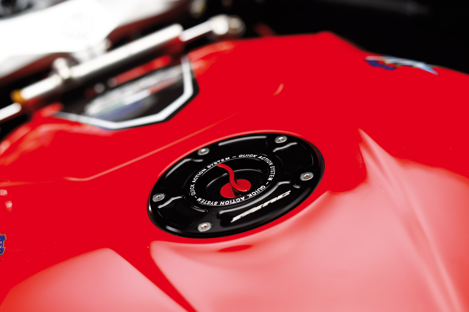 Adoption of carbon fibre extends to the side panels, lower fairing, rear mudguard and front mudguard spoiler, upper and lower chain guard, the upper airbox section and the left and right intake covers. Made of forged aluminium alloy, the wheels have been designed and built exclusively for this model. Even the battery – a light lithium (Li-Po) 12.8 V 4 Ah unit – is model-specific. Foot controls are also new: peg positions are adjustable and the shift lever features a sensor for fast gear changes.
