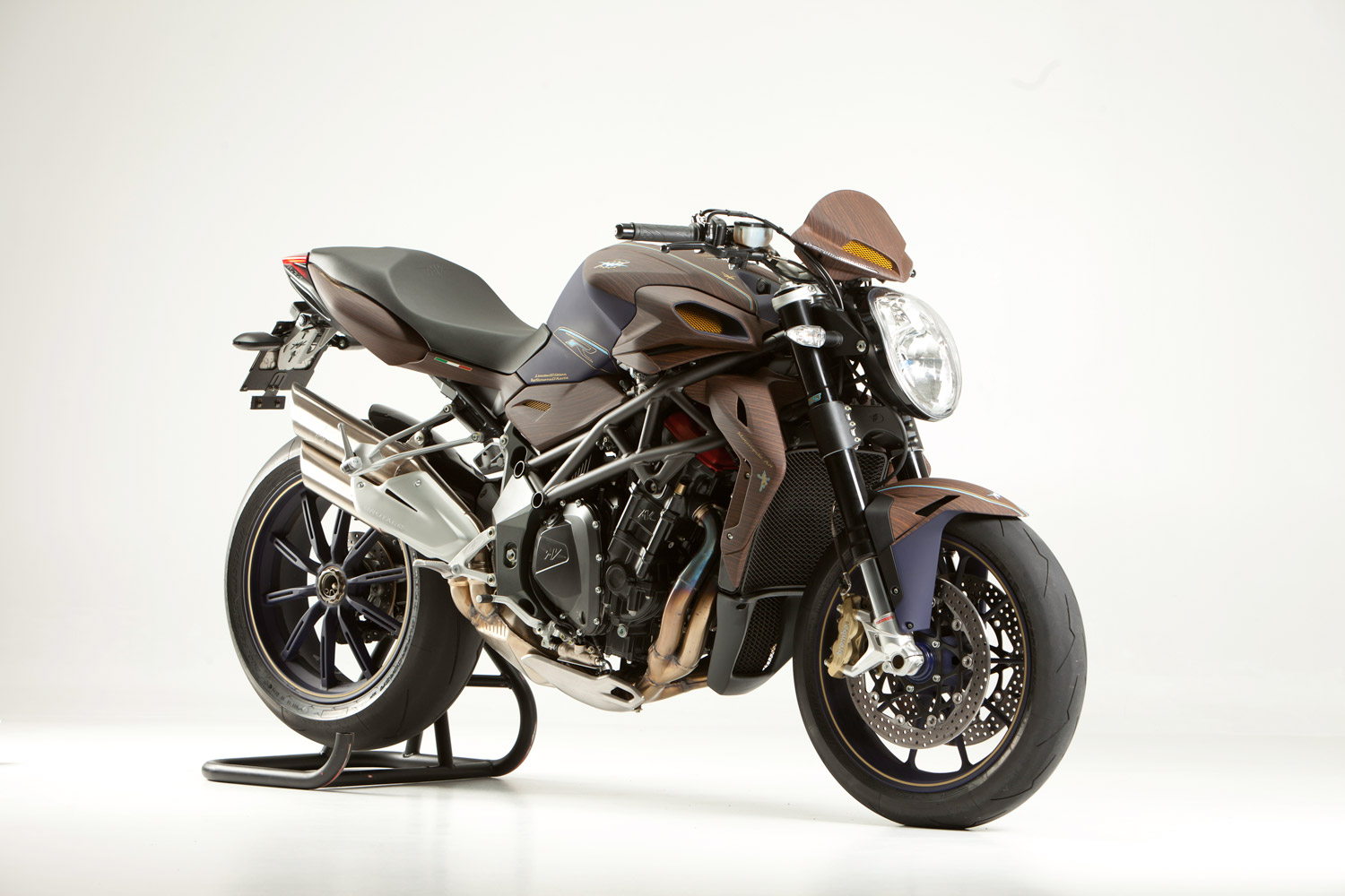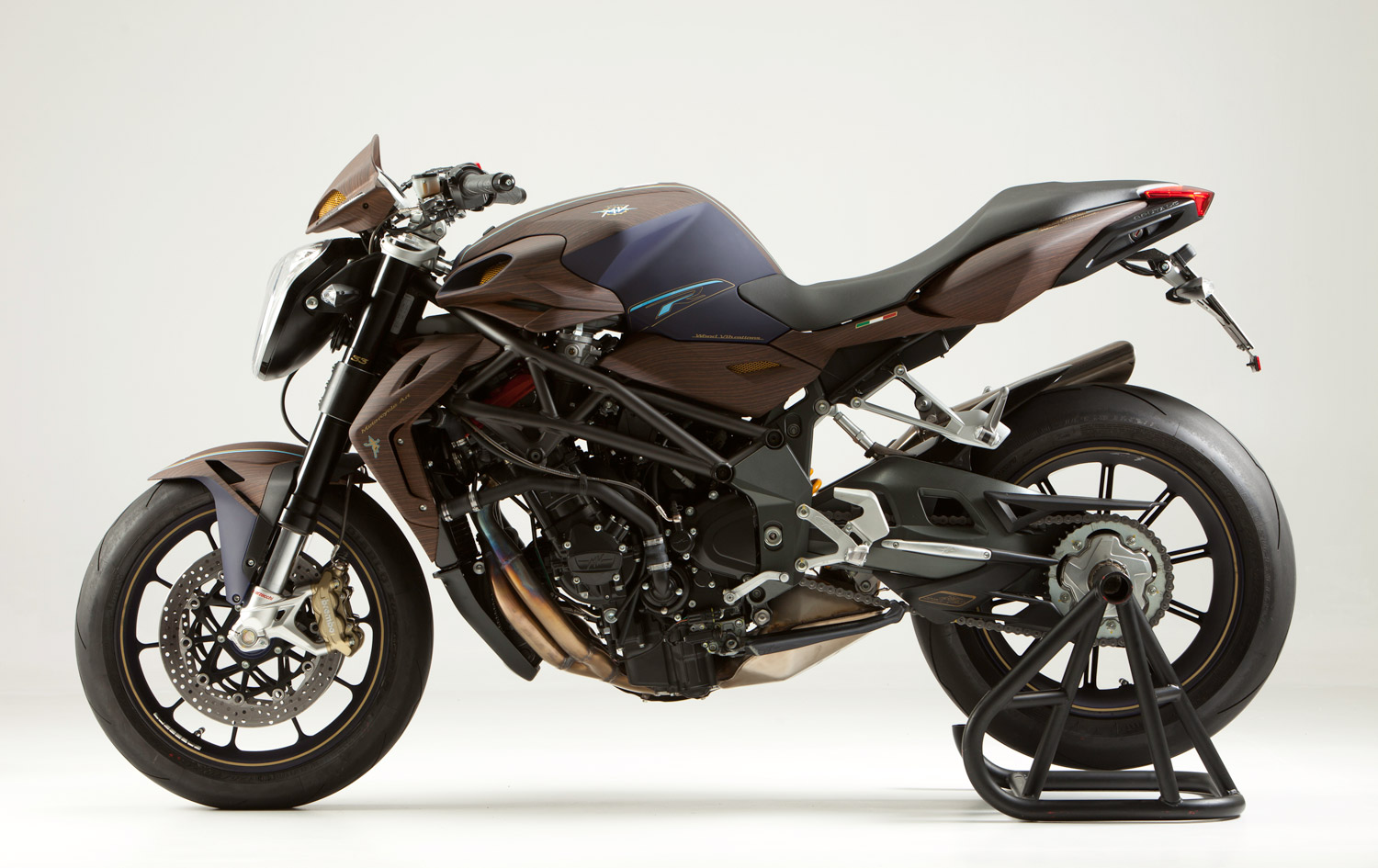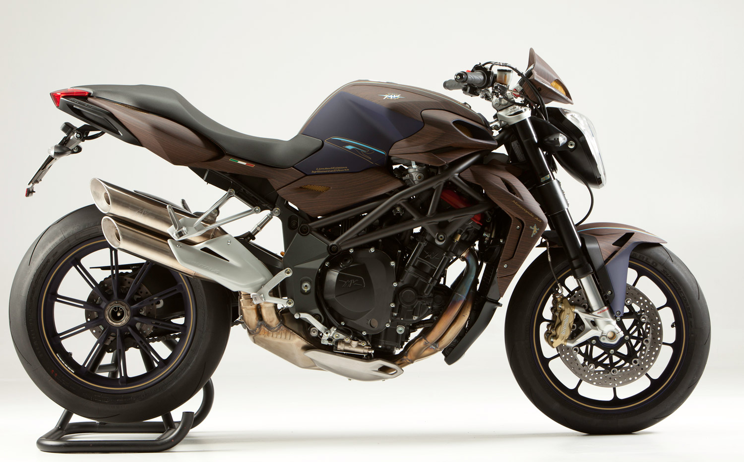 The collaboration between MV Agusta and designer Simone D’Auria continues this year resulting in the 2013 Brutale California in D’Auria’s signature timber inspired styling called ‘Wood Vibrations’. Based on the 2012 MV Agusta Brutale 1090 R with unaltered underpinnings, the 2013 California model comes clad with carbon fibre wrapped in a dark walnut wooden finish with detailing done in MV Agusta’s traditional blue and gold colours.