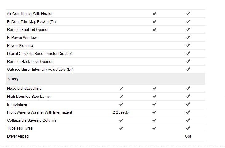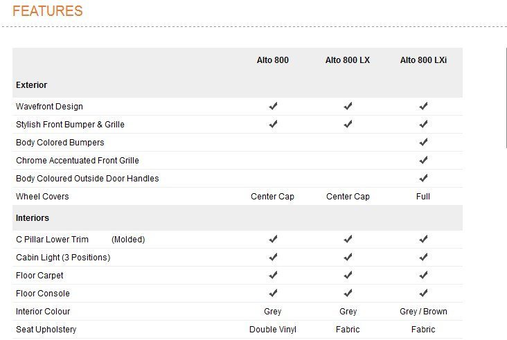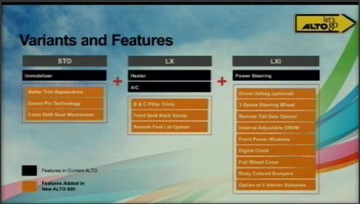 The new Alto 800 will be available in three variants – STD, LX and LXI. Here we have a variant wise breakup of the all the features of the new car