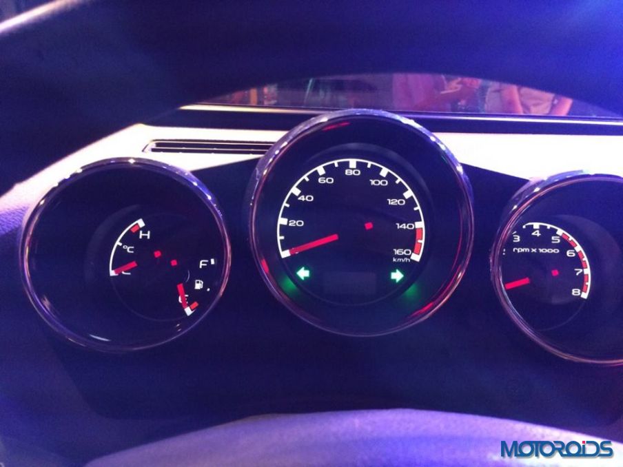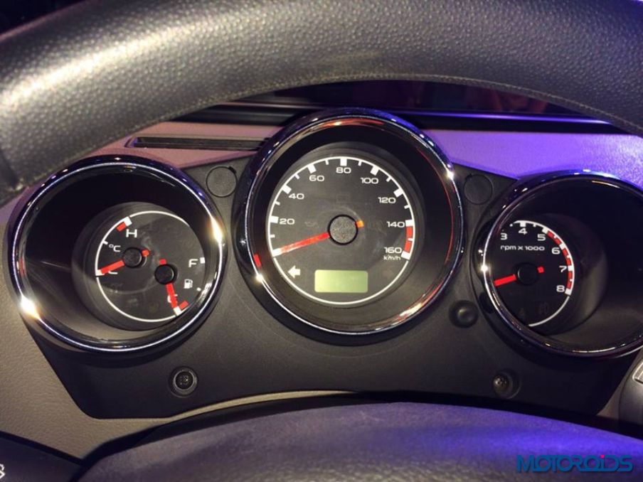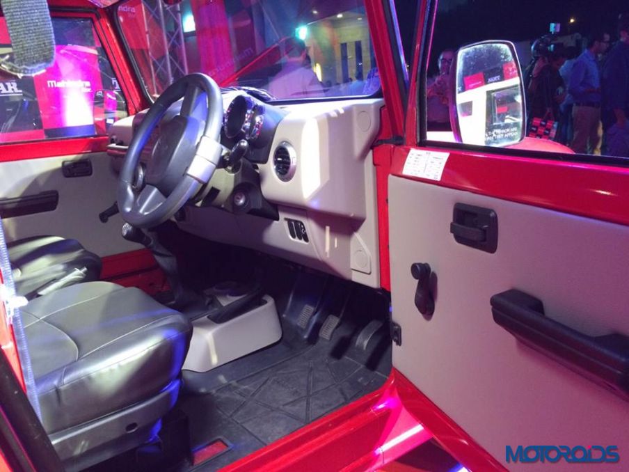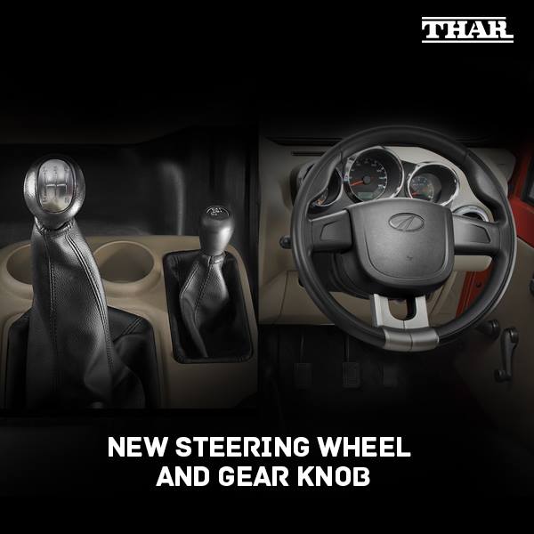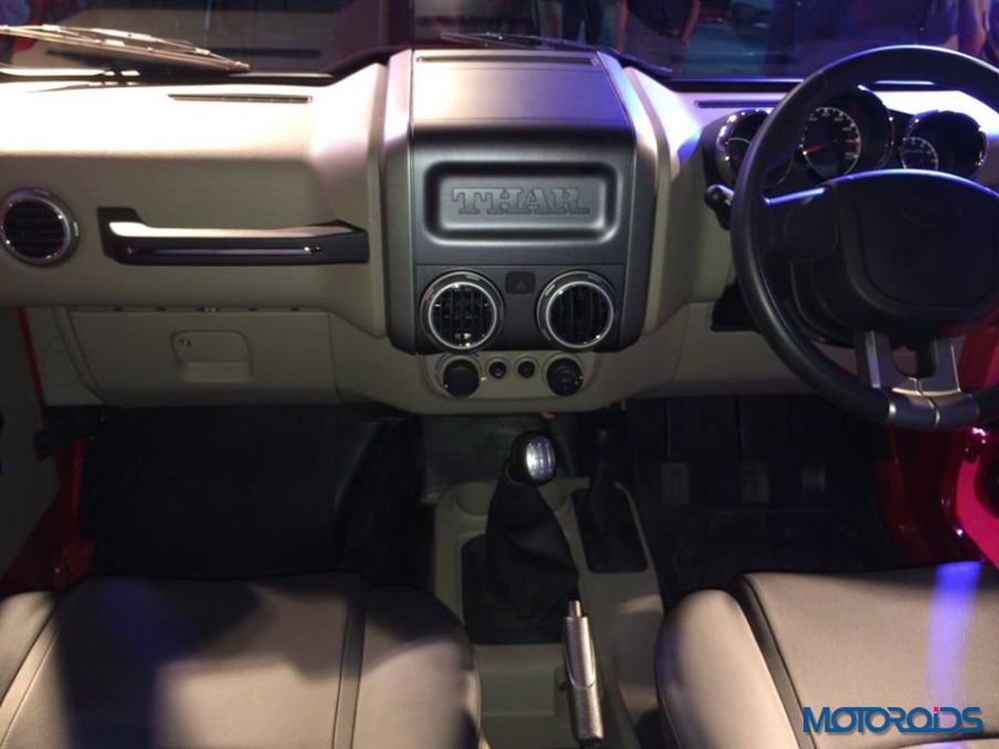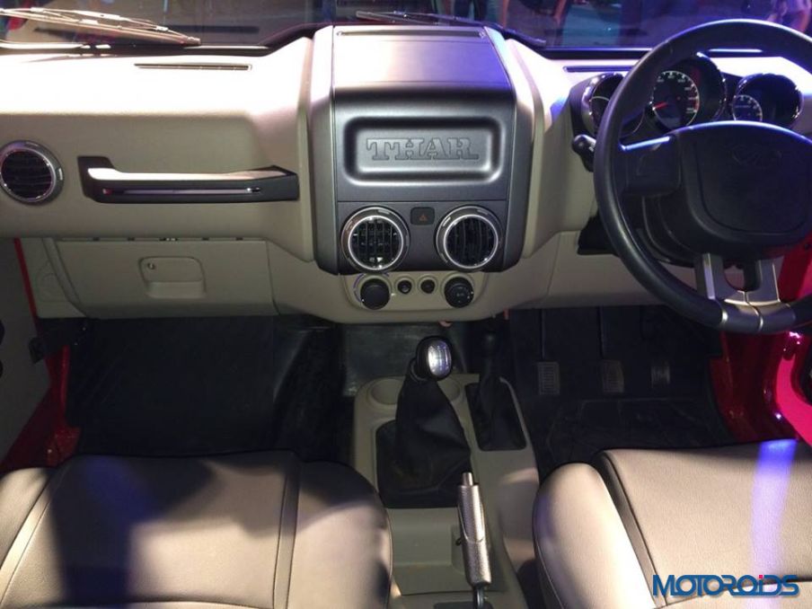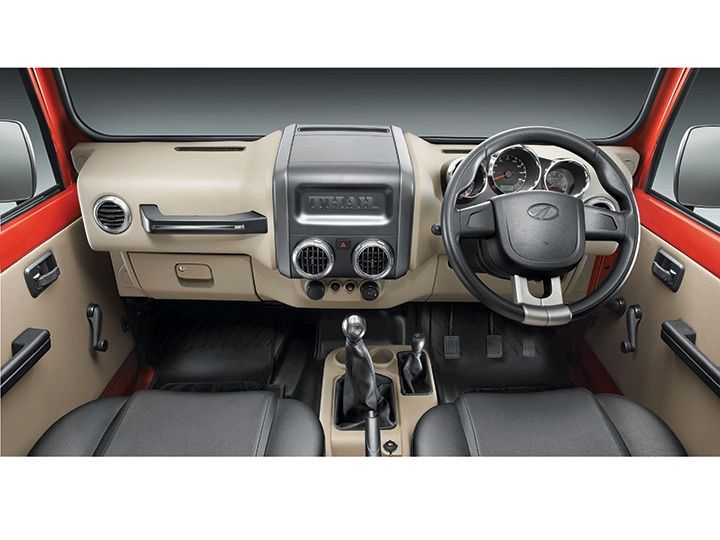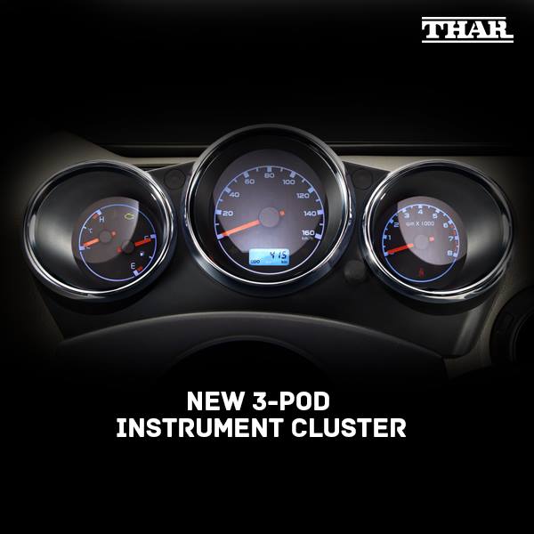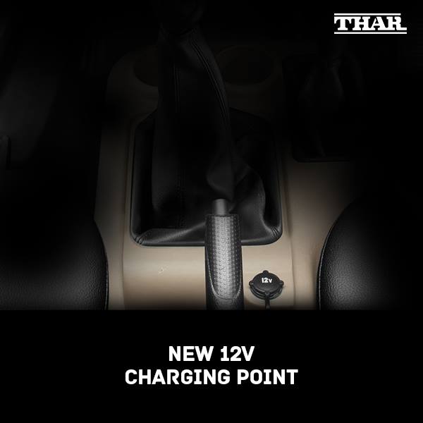 The all-new dual tone dashboard looks like a miniaturized war bunker; gets circular HVAC vents, windshield demister, prominent Thar branding on the new center console, a 12V socket and fresh switchgear.