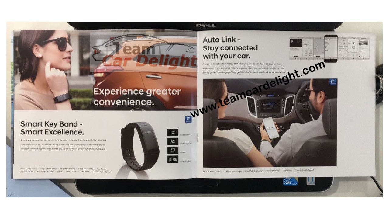 More details about the new Hyundai Creta facelift continue to flow in as we’ve now stumbled upon the brochure of the upcoming compact SUV. The leaked brochure reveals the new features that the upcoming 2018 Hyundai Creta facelift will receive. The new Smart Key Band, for example, will get inbuilt functionality of a smart key and can be used to open the door and start the vehicle without a key. The Smart Key Band also doubles up as a fitness tracker, calculating your steps and calories burnt.