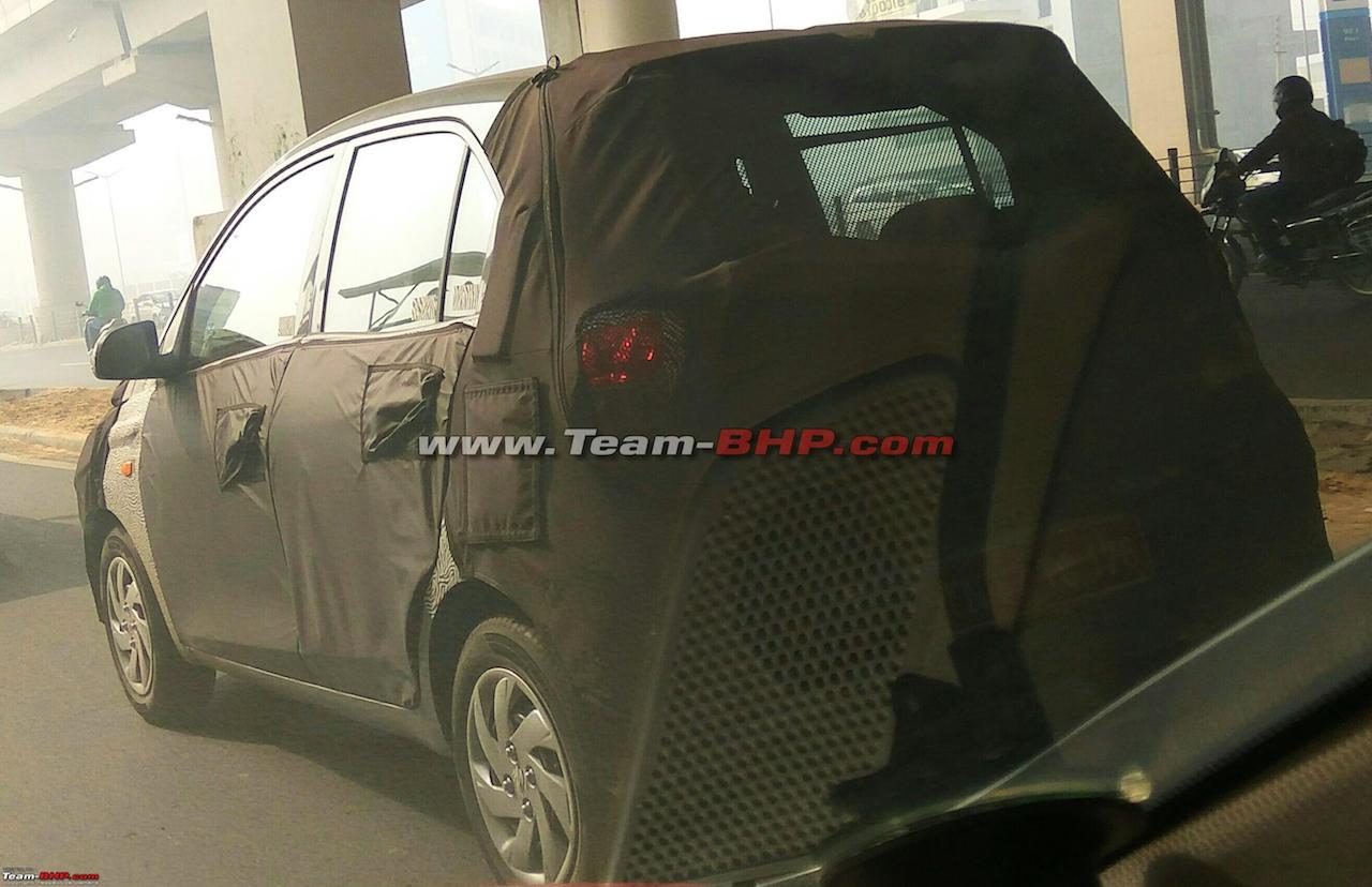 Spotted yet again, by the looks of it, the new Santro’s glass area does resemble the i10 quite a lot. The tailgate drops nearly vertically into an almost non-existent rear overhang. The tail-light appears to be lit by a conventional bulb and there’s a high mounted stop lamp too. However, Hyundai might just surprise by offering LED units on high-spec variants. This particular test mule appears to be riding on 14″ steel wheels but alloys could be offered as an option.