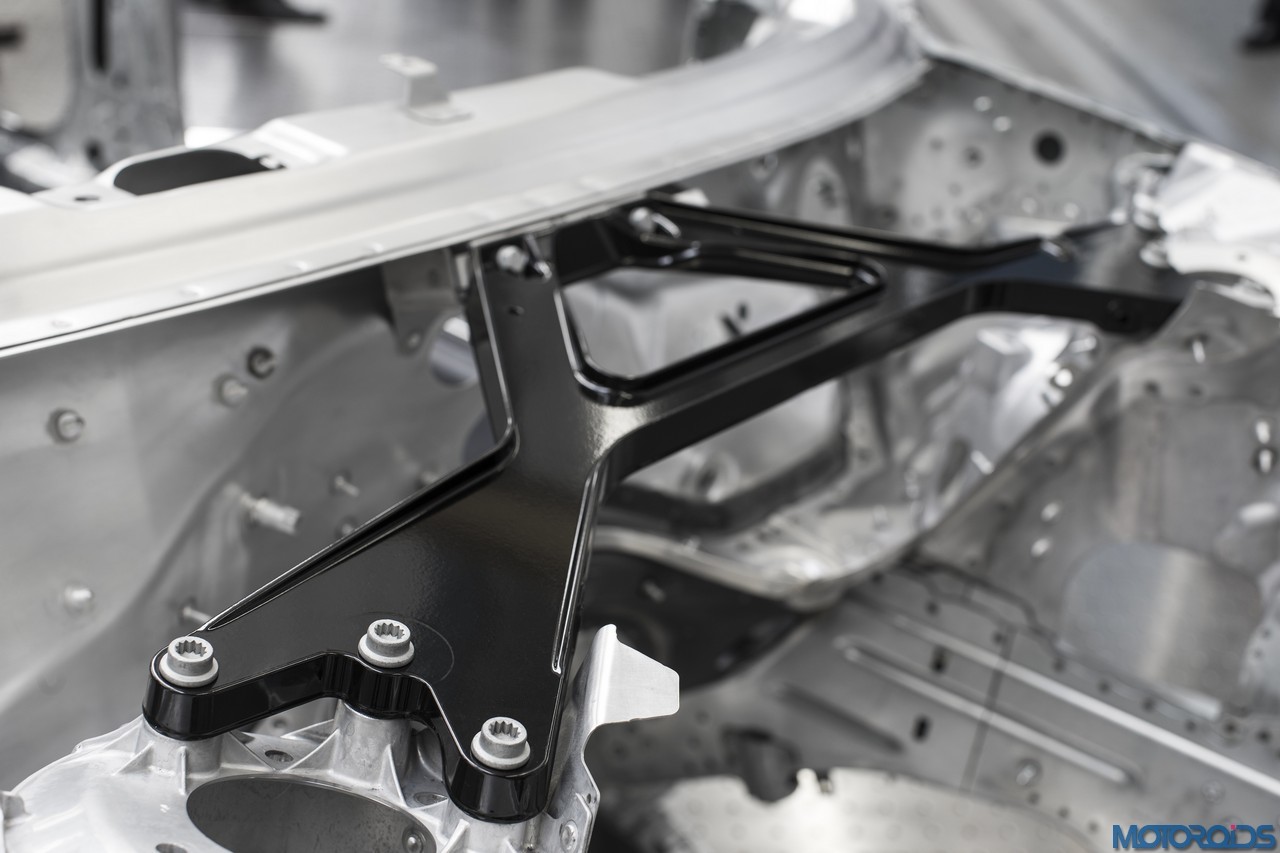 Rounding out the intelligent mix of materials is the magnesium strut brace. A comparison with the predecessor model shows that it contributes a 28-percent weight savings. Aluminium bolts secure the connection to the strut tower domes, making them a guarantor of the body’s high torsional rigidity.