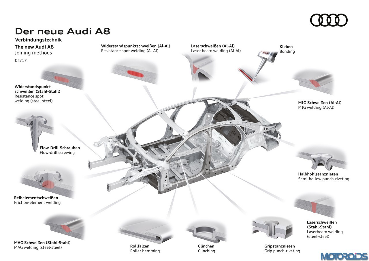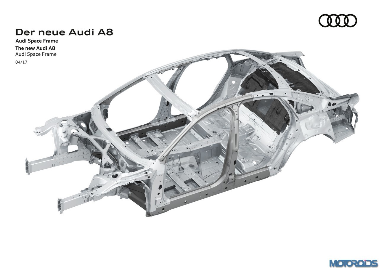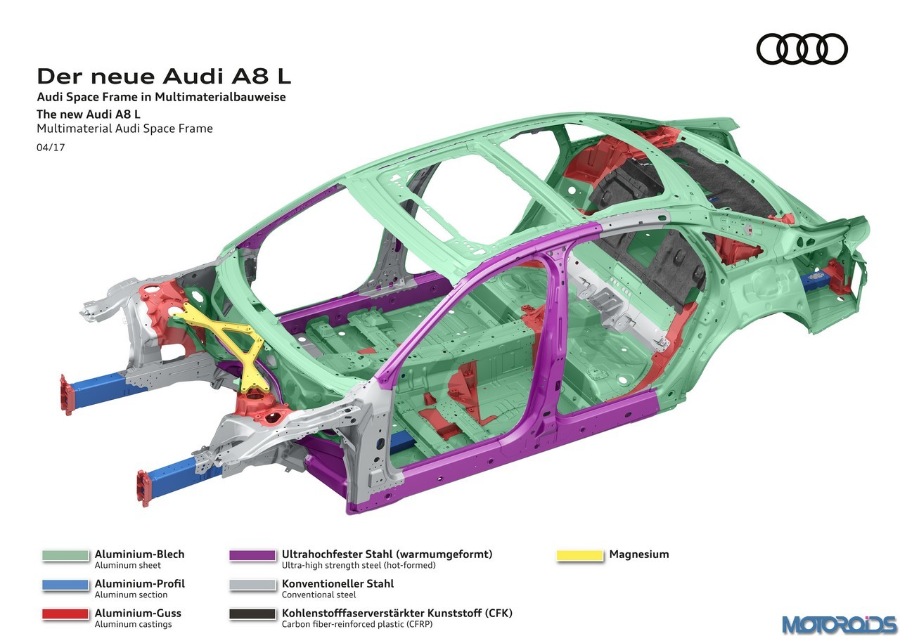A mix of aluminium, steel, magnesium and carbon fibre-reinforced polymer (CFRP) ushers in a new stage in multi-material construction in the Audi Space Frame (ASF) for the next generation of the Audi A8.