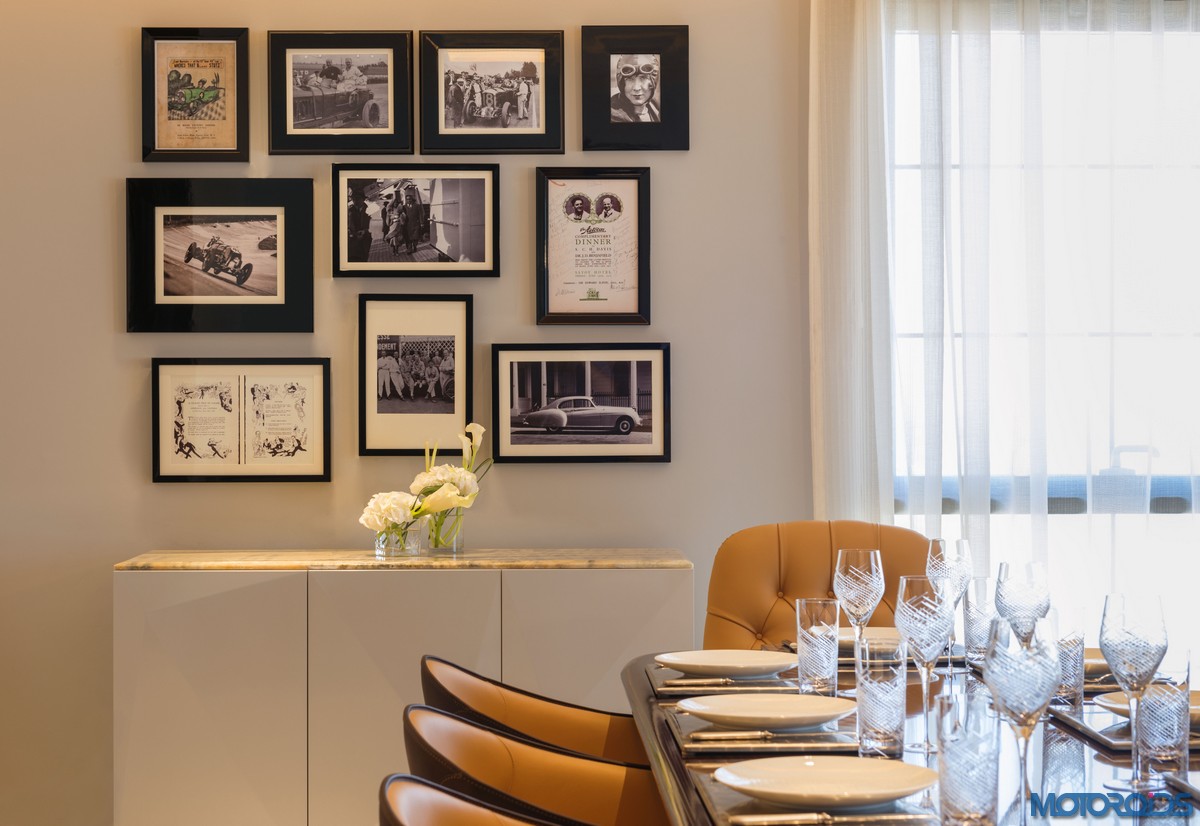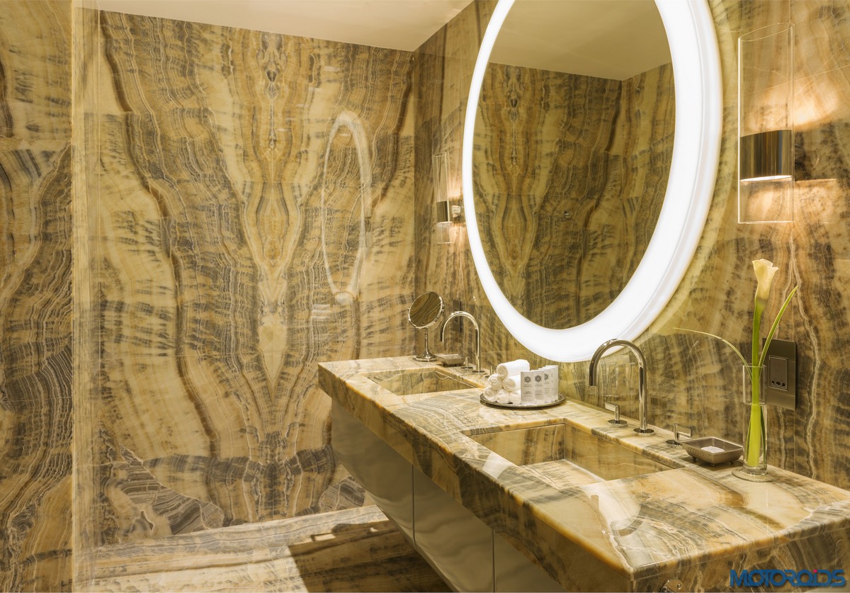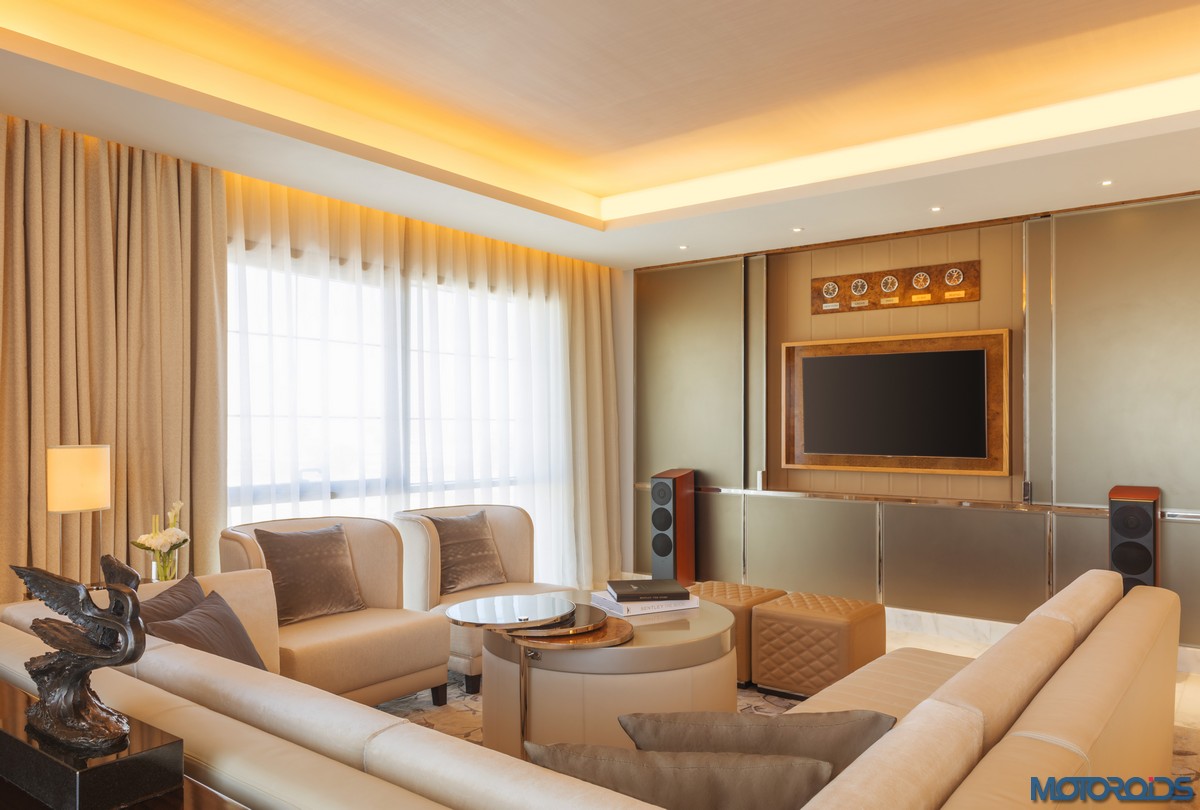 In the living room, there’s a LED chandelier inspired by the headlights of the Mulsanne above the 12-seater smoked fiddleback veneer dining table. An ultra-luxe fluted linen leather sofa, accompanied by two camel hide ottomans with Bentley’s signature diamond quilting, takes care of the seating arrangements. There’s also a carved rug reminiscent of the matrix grille on the Mulsanne.