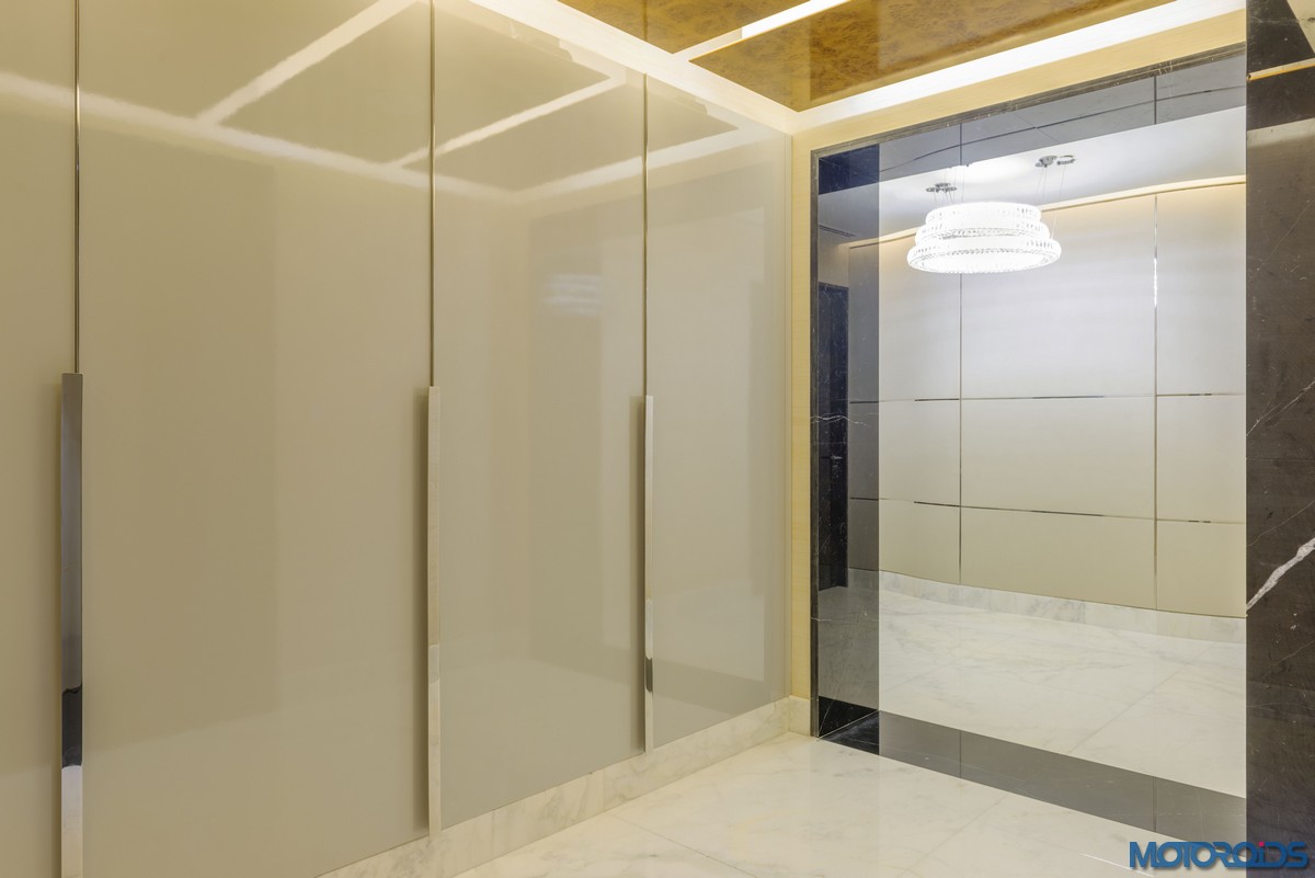 The master bedroom displays fluted Bentley leather walls, bedside tables inspired by the Mulsanne Speed wing emblem in Burr walnut and carved textured carpets reflecting the matrix grille. Light features are made from backlit domes of Bentley paints and in the dressing room; Bentley’s signature diamond detailing is etched into the frame of the glass mirror.