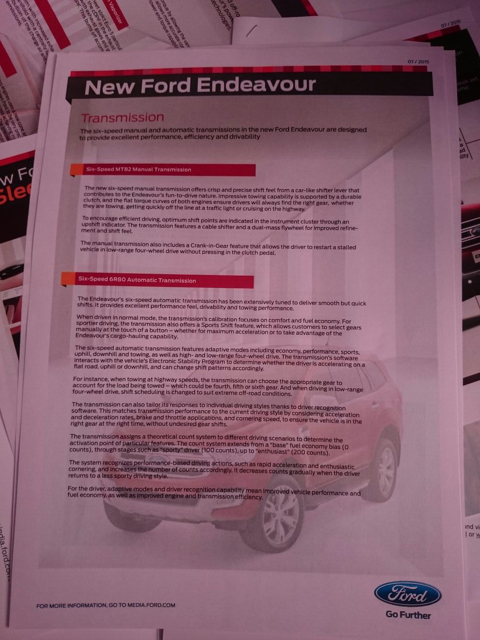 The automatic transmission on the new Endeavour features advanced driver recognition software. This, according to the company, allows the transmission to adapt to the current driving style by analyzing acceleration and deceleration rates, brake and throttle applications, as well as cornering speed. A four-wheel drive system, an active transfer case with torque on demand, a Terrain Management System, 225 mm of ground clearance are some other features of the new Endeavour.