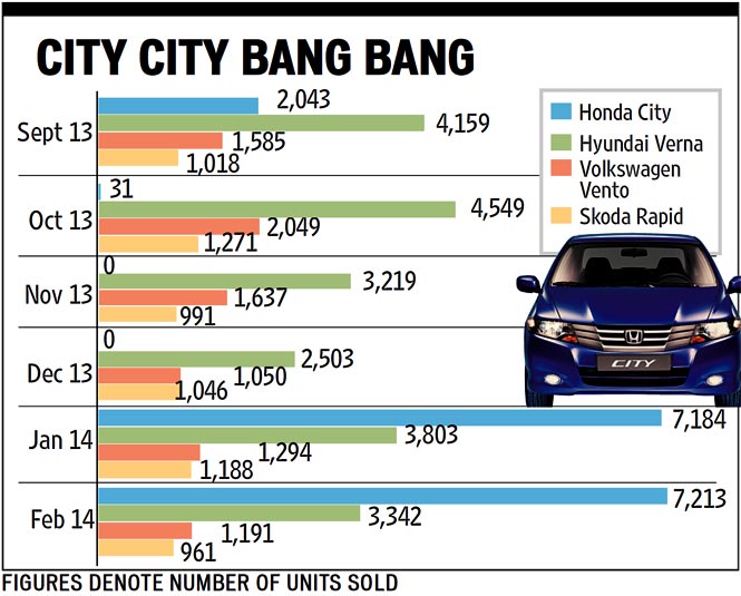 “City’s position in the segment in petrol was never disputed but we suffered because we did not have a diesel engine. We are happy to see the huge demand for the all new City where we have introduced a diesel engine as well,” said Jnaneswar Sen, senior vice-president, marketing and sales, Honda Cars India Ltd.