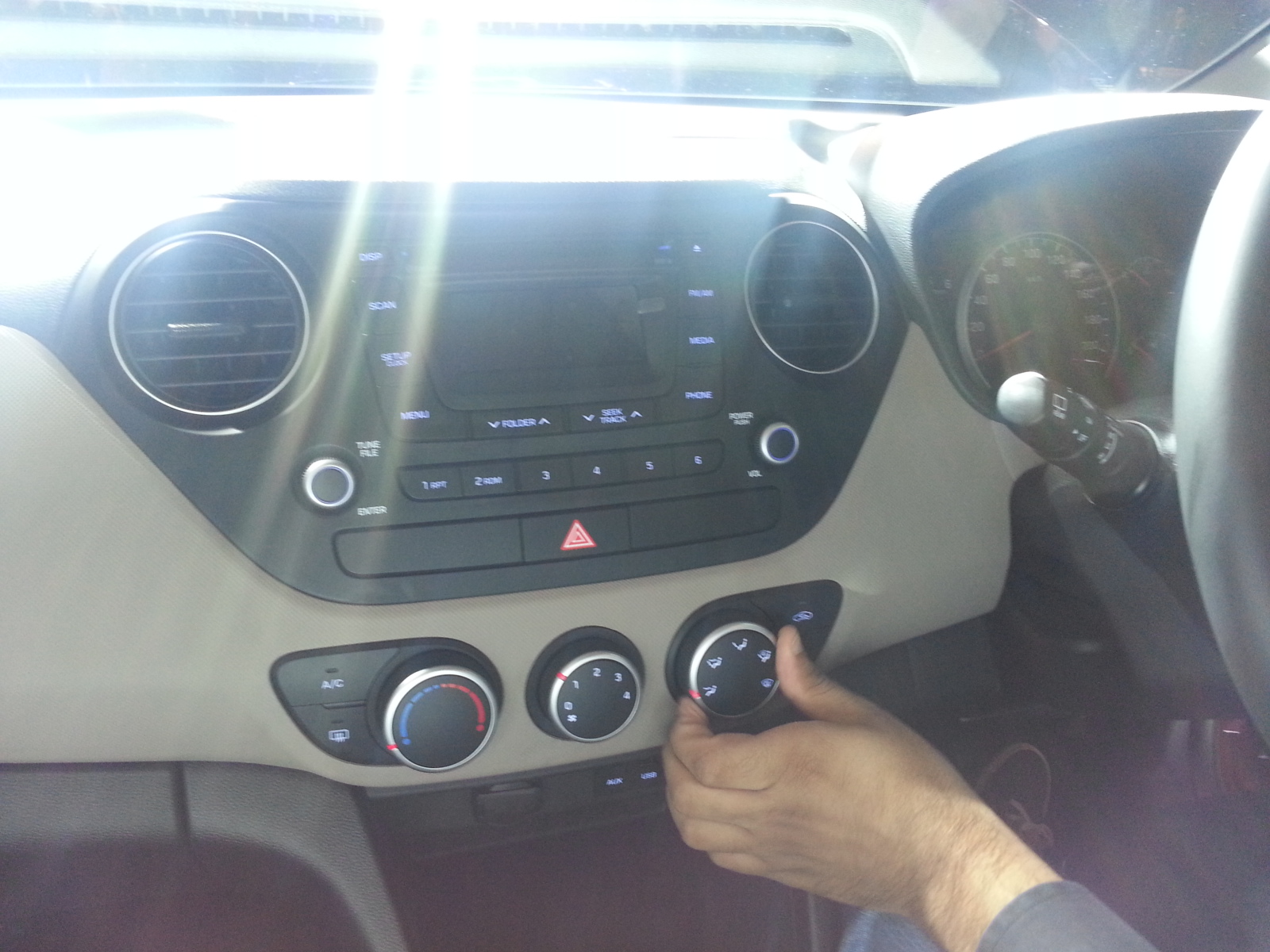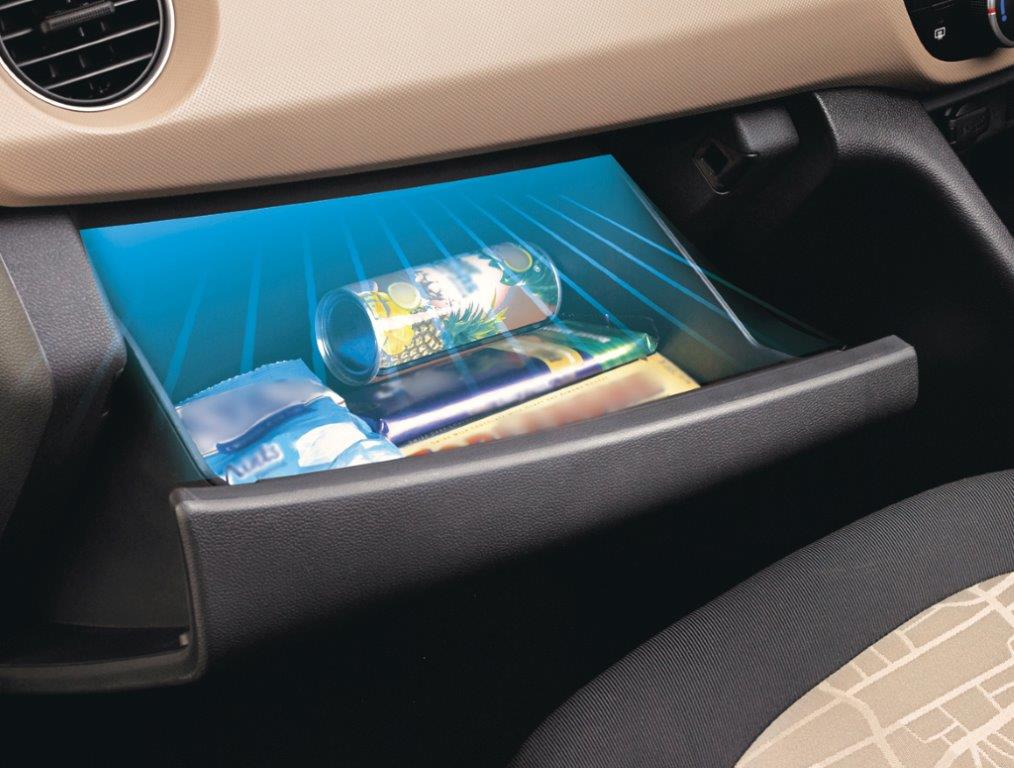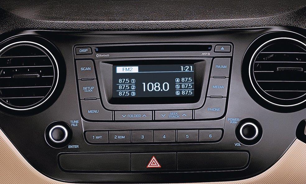 The Grand i10 offers some first-in-segment features such as Rear AC vents, Cooled Glove box, Integrated audio system with 1 GB hard drive, smart key with push button start and stop for keyless entry/exit and ignition on/off and auto folding outside rear view mirrors. The audio system of the new Grand i10 also offers Bluetooth, USB and Aux-in connectivity, along with steering mounted audio controls.