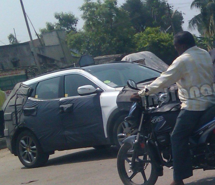 We recently reported that the all new 2014 Hyundai i10 has been caught testing near HMIL’s Chennai plant. Now, here are spy pics of a car that was found close the camouflaged test mule of the new i10. The car in the pictures is the new Hyundai Santa Fe which will be soon launched in the fast developing Indian premium SUV market.