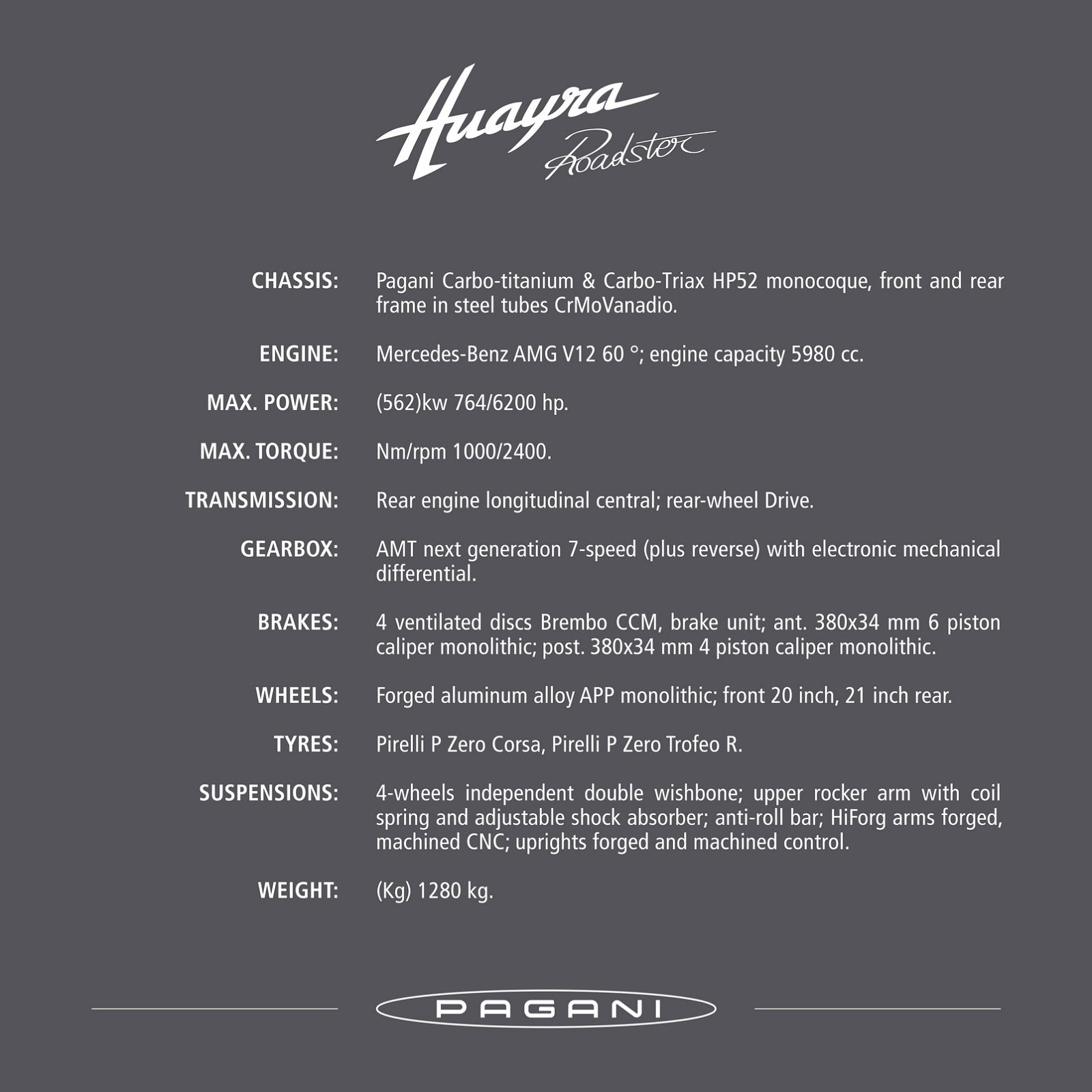 In Roadster guise, the engine is tuned to produce 764 horsepower and 1000 Nm of torque, while being mated to the same XTrac seven-speed AMT used in the Huayra BC. Huayra Roadster buyers have a choice of either Pirelli P-Zero Corsa tires designed specifically for Pagani, or P-Zero Trofeo R tires.
