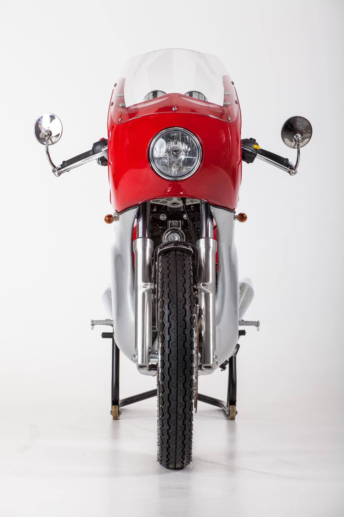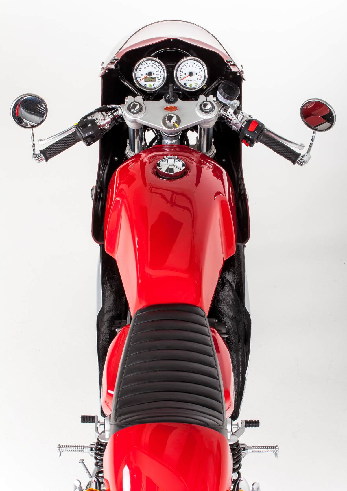 Inspired by Jawa’s racing history, the 350 Special features a two-piece full fairing with dual tone paint, clip-on handlebars, bar-end mounted rear view mirrors, and a rider-only saddle with rear cowl. Chrome covered parts include front fender, exhaust, turn-indicator housing and the back of the rear view mirror. The spherical headlight and the paint-job further enhances the retro styling of the motorcycle.