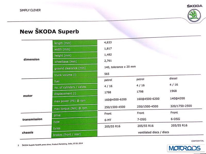 We are testing the new Skoda Superb today, and will be bringing to you a detailed review of the segment leading car very soon. In the meantime, we have gathered detailed information on the car, as to what the tech specs, features and the changes made to the car would be. Let’s start with the technical specifications