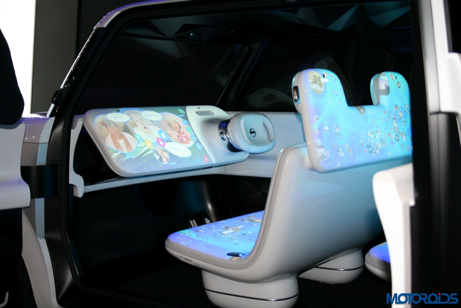 The exterior features a gloss white paint job with a few bits of satin white silver here and there. The front and rear bumper as well as the door panels feature LED displays. The interiors feature white seats which can be turned around, and include multiple displays. The visuals from these screens can be altered according to personal preference like playing games or watching a video. The air-conditioning and audio system are controlled via voice commands. Once the driving mode is activated, the front display changes into the instrument panel which displays navigation, meters, etc.