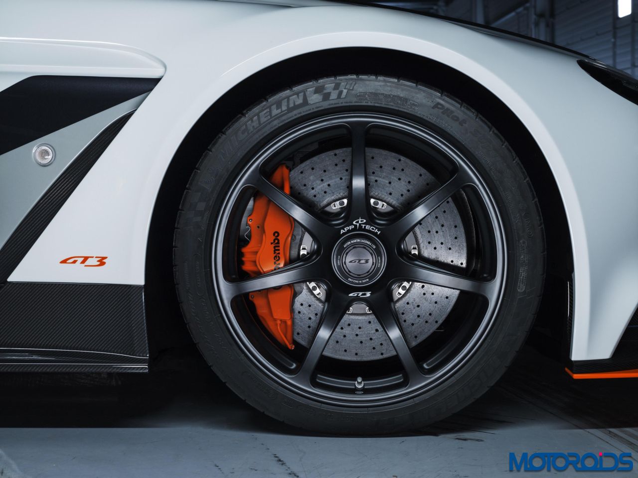 The GT3-inspired special edition is lower and wider than any of its siblings in the Vantage family. A broader track – front and rear – brings even more composed cornering thanks to a reduction in lateral load transfer, while the use of Michelin Pilot Super Sport tyres provides even more assured handling. The new car weighs in at only 1,565 kg2.