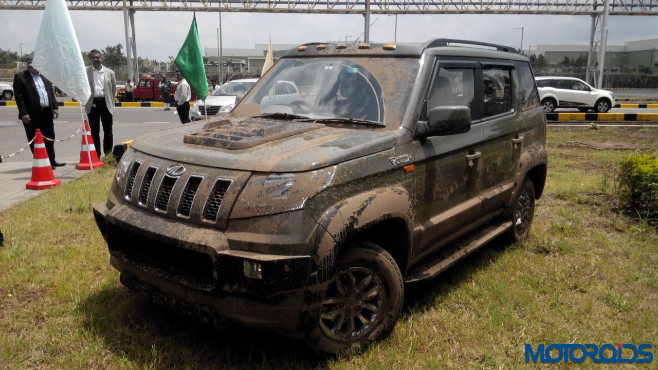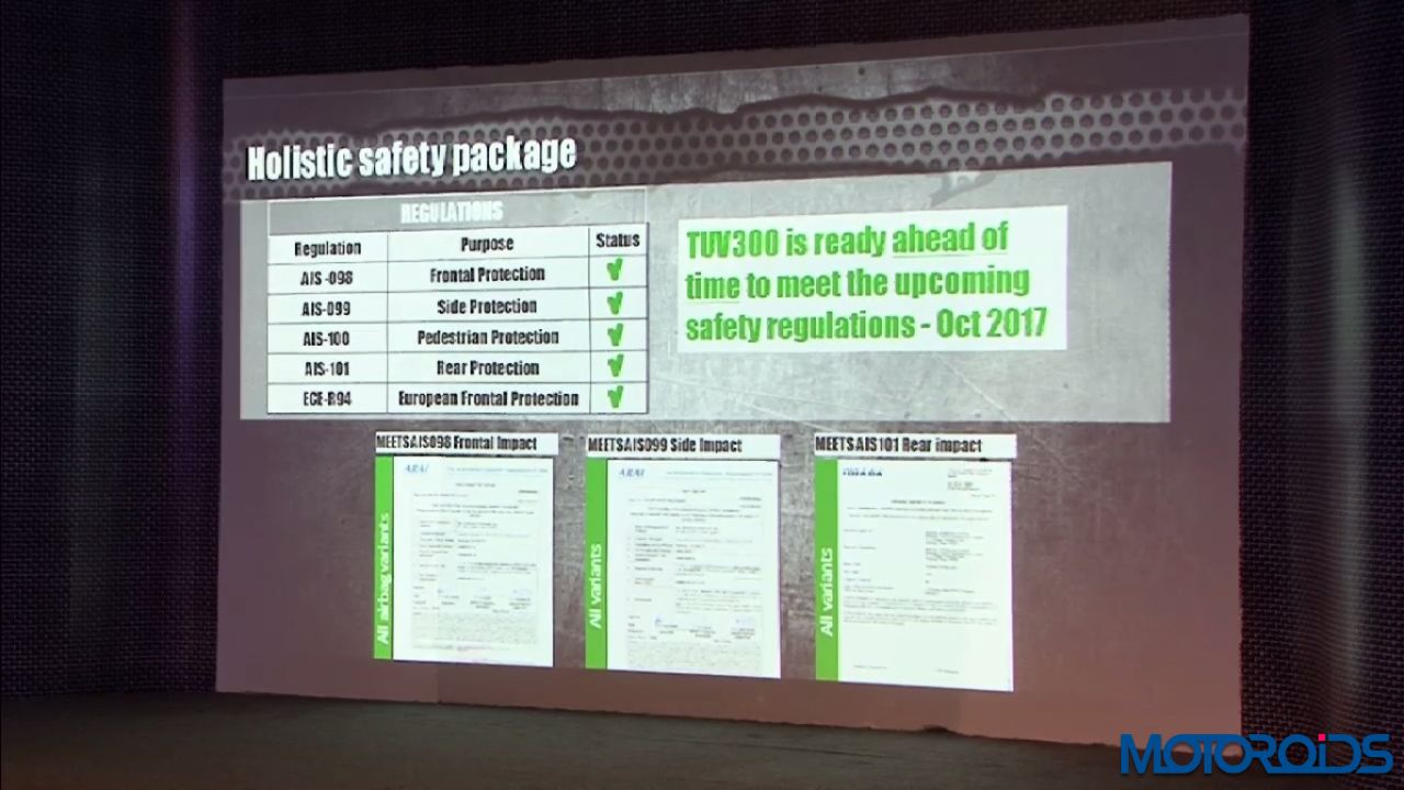 The list of safety features on the TUV300 toughened high strength steel body shell for all-round impact protection, a 3rd Generation crash-worthy chassis with high torsional stiffness and durability, hydro-formed crush tips that collapse in case of impact and help protect passengers, Dual Airbags, Anti-lock Braking System (ABS) with Electronic Brake-force Distribution (EBD), Corner Brake Control (CBC) to maintain the driver-intended path during braking while turning, Automatic door locking to prevent doors from opening accidentally, crumple zones and strong side intrusion beams.