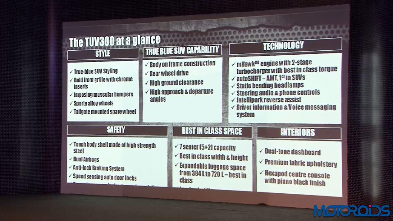 Mahindra & Mahindra unveiled its much-awaited sports utility vehicle (SUV), the TUV300 at Chakan in Pune, Maharashtra. The new TUV300 has been designed in-house inspired by a battle tank and is built on an all-new platform.