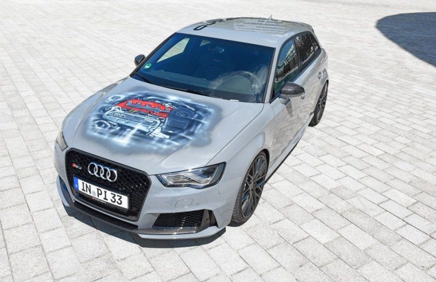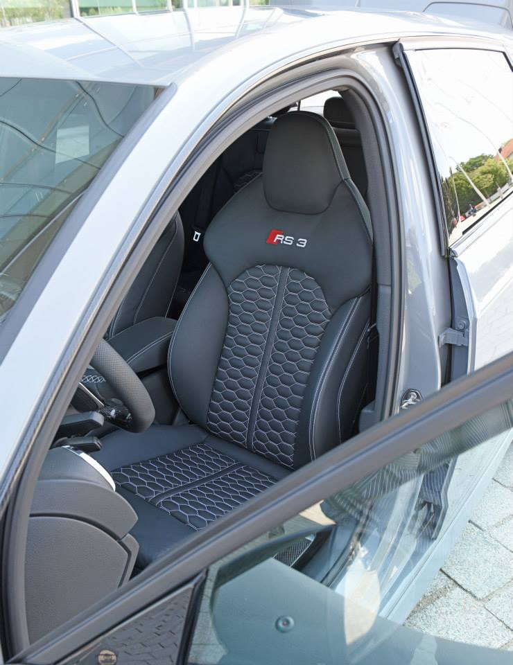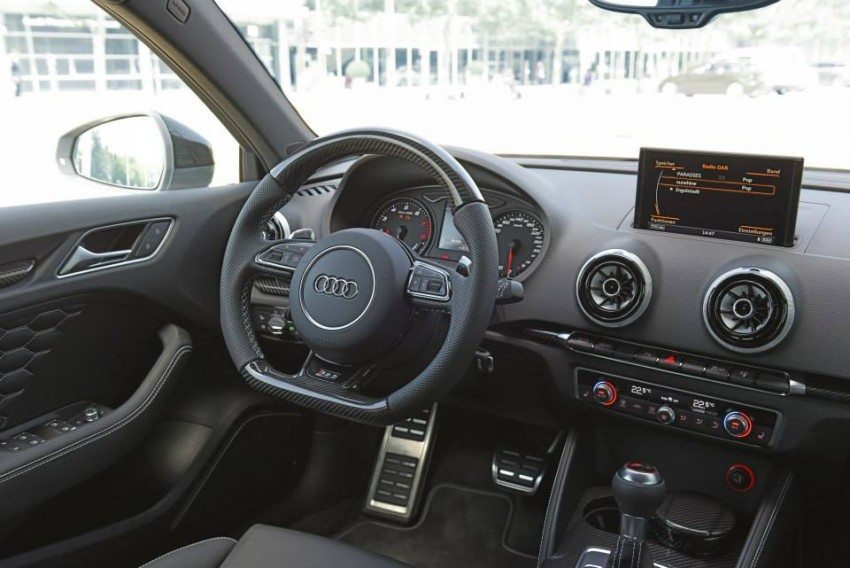 The carbon-fibre treatment extends to the interior as well. The black material can be found on the steering wheel, cup holder, seat shells and even the ashtray! According to Audi, “all of the car’s plastic mechanical parts have also received the same paint as the body or a lacquered glossy black look.” Powering the one-off Audi RS3 Sportback is a 2.5-litre, five-cylinder TFSI turbo engine that chucks out 367 PS of max power and 465 Nm of shove. Fed via a dual-clutch 7-speed S Tronic transmission, and sent to all four wheels via the Quattro system, all this power means that 100 km/h comes up in just over 4 seconds!