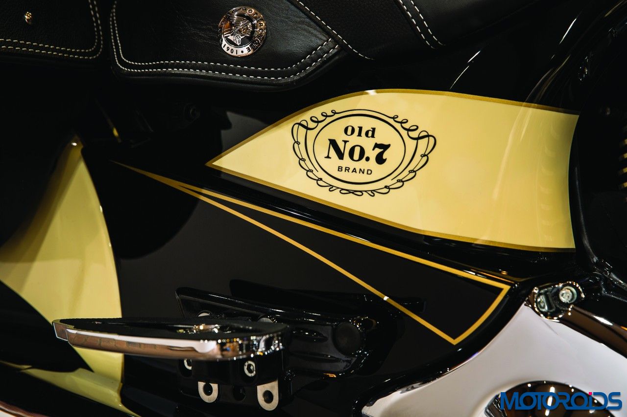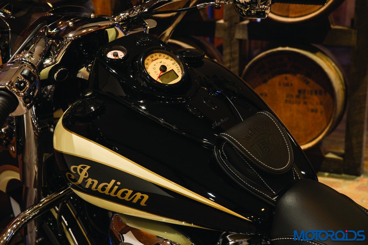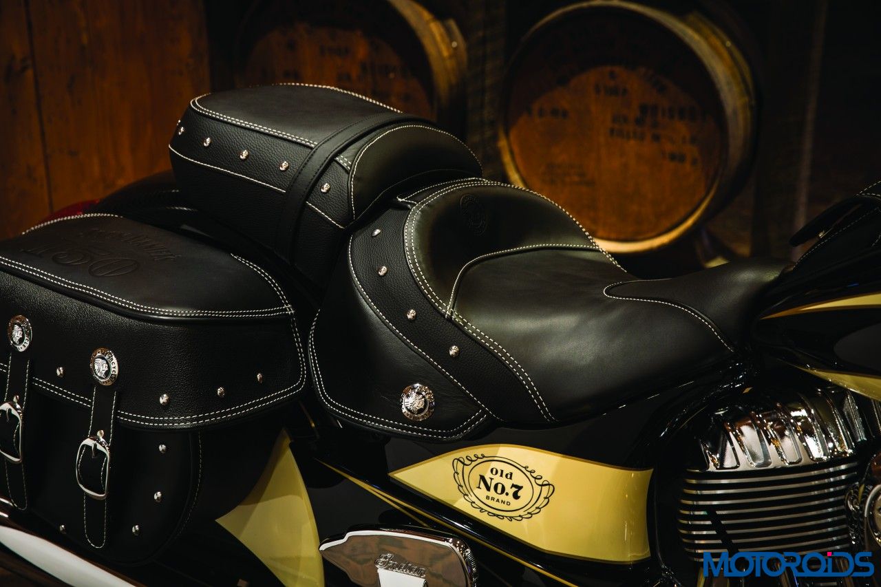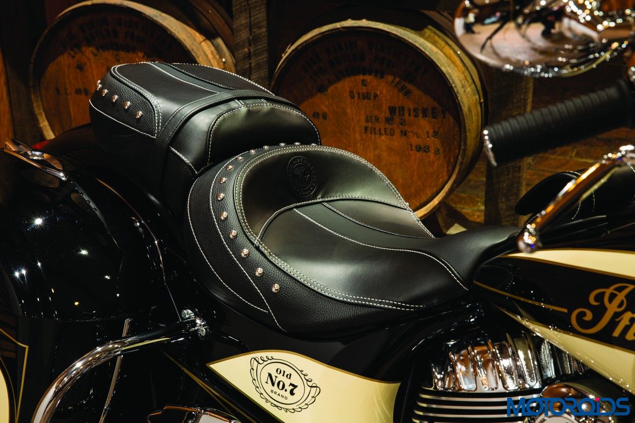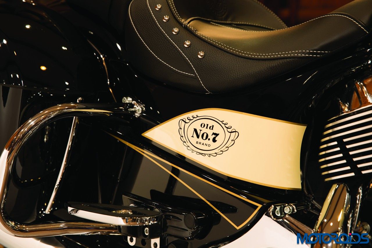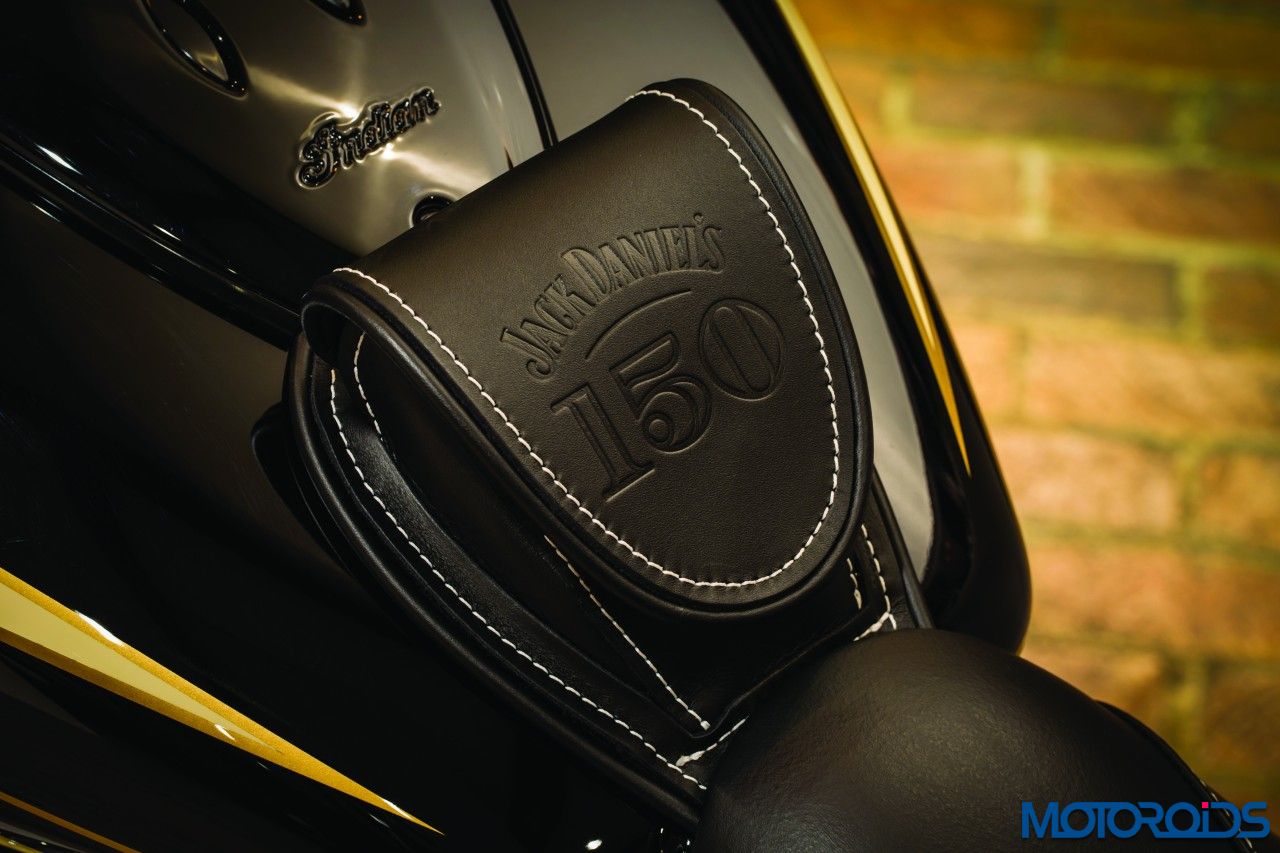 The fuel tank features an Indian Script badge, coloured dual fuel caps, gloss black gauge cluster housing and Jack Daniel’s 150th anniversary branded leather pouch. The sculpted two-piece seats receive white stitching, side panels that tout Jack Daniel’s Old No. 7 logo, saddlebags branded with Jack Daniel’s 150th Anniversary logo and gloss black taillight housing. Finally, there’s an inscription of Jack Daniel’s “Bottles and Throttles Don’t Mix” mantra.