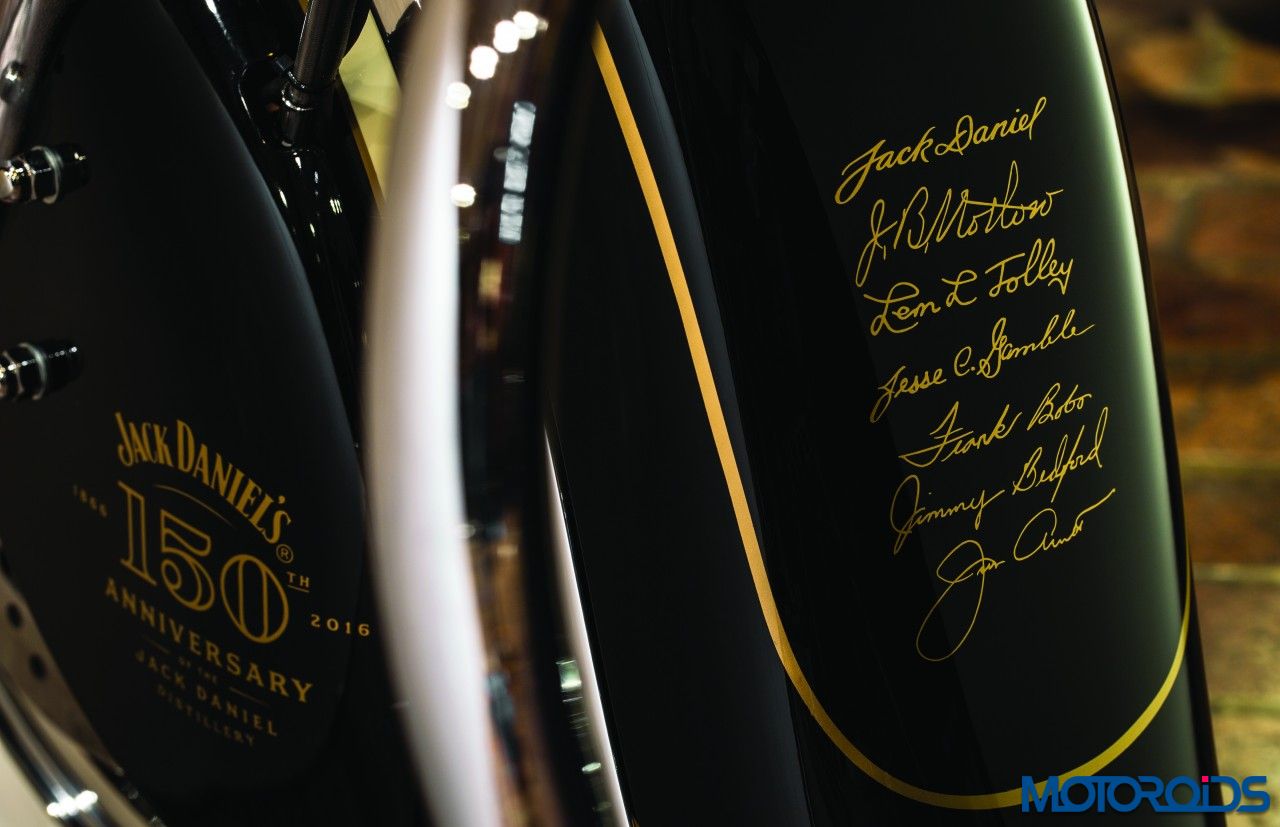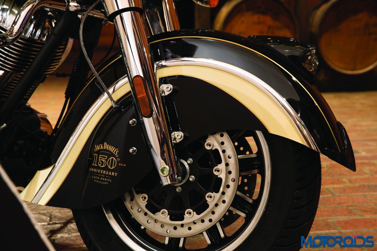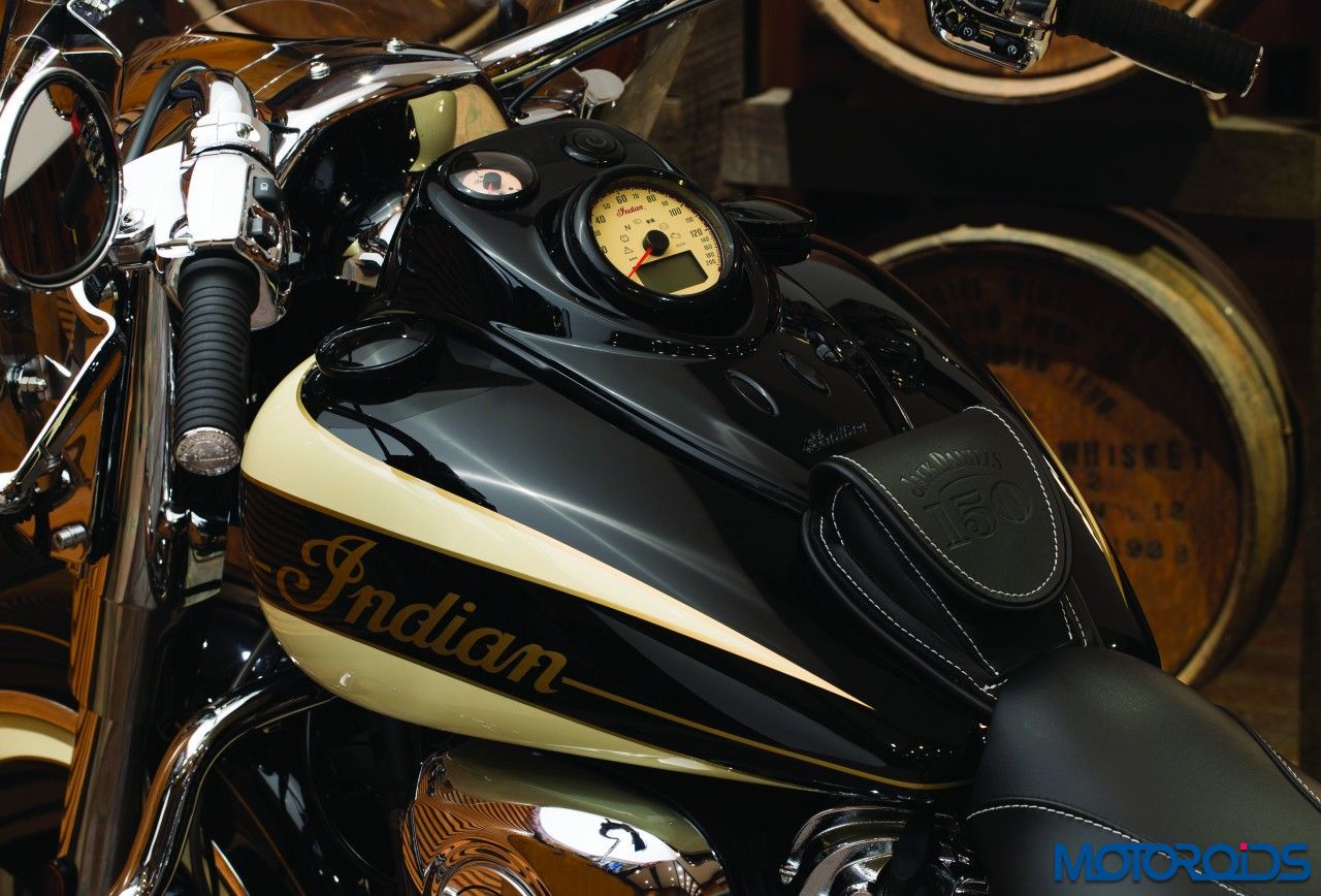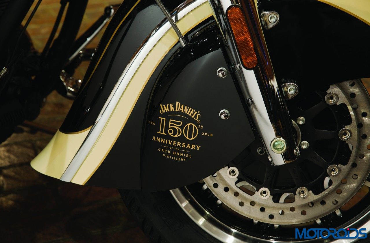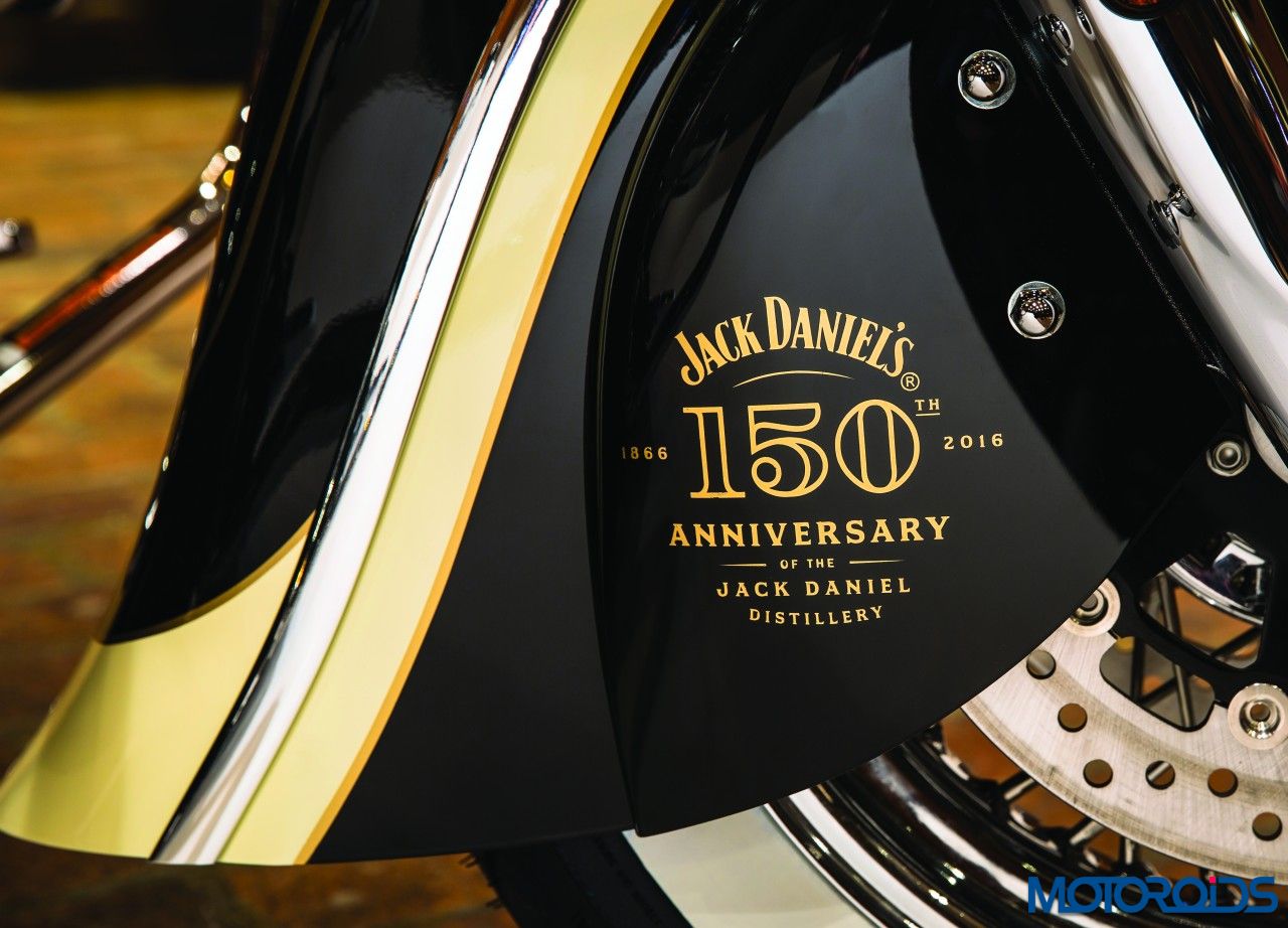 The fuel tank features an Indian Script badge, coloured dual fuel caps, gloss black gauge cluster housing and Jack Daniel’s 150th anniversary branded leather pouch. The sculpted two-piece seats receive white stitching, side panels that tout Jack Daniel’s Old No. 7 logo, saddlebags branded with Jack Daniel’s 150th Anniversary logo and gloss black taillight housing. Finally, there’s an inscription of Jack Daniel’s “Bottles and Throttles Don’t Mix” mantra.