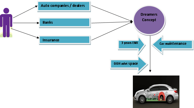 Consumers who wish to purchase a car through Dreamers can avail of the offer by paying a 25% down payment with EMI tenure of 5 years. Dreamers will pay the EMIs for the first three years while the consumer will make the payments for the last two years; in return Dreamers will utilize 40 – 60 % of the customer’s car space. This space is the commercial driver for Dreamers, which will then sign up both long and short term contracts with interested advertisers.
