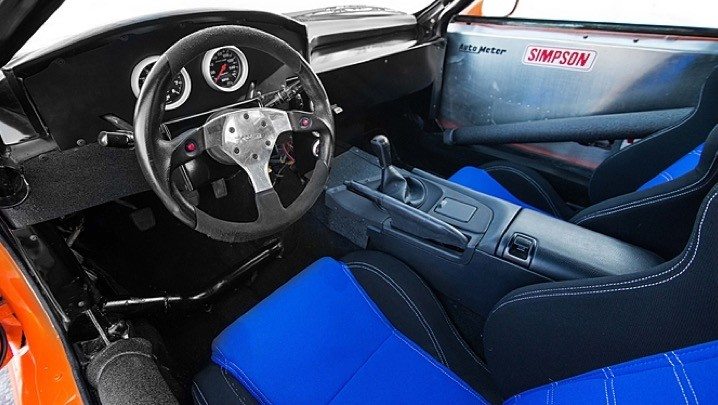 Other go-faster additions include a heavy-duty suspension, a full roll cage, competition seats, a Jaz Products fuel cell, a Bomex body kit along with an APR wing, and Dazz alloy wrapped with with Yokohama rubber. A fiery orange paint job and wild graphics by Modern Image of San Diego give it the unique character that has become oh-so popular today.