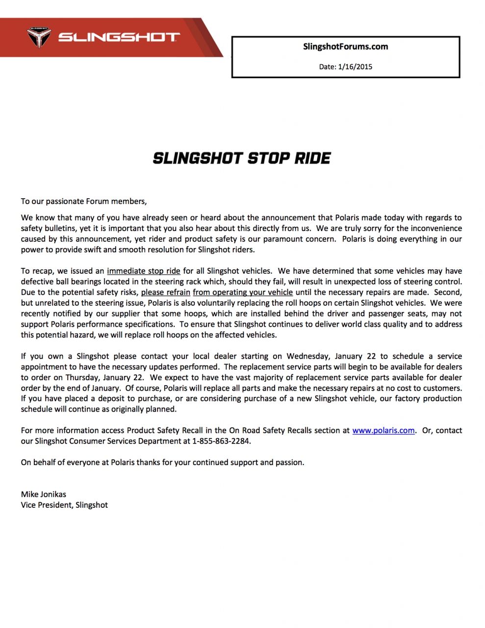 Polaris has issued a voluntary recall for Slingshot vehicles and will replace the faulty parts on the affected vehicles at no cost to the customers. An image of the newsletter uploaded on the Slingshot Forum reveals this recall. The owners of the Slingshot can contact local dealer starting on Wednesday, January 22 to schedule a service appointment to have the necessary updates performed.
