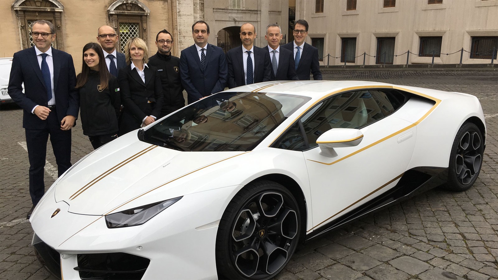 As reported earlier, the Huracán RWD, which was donated to the Pope in the presence of Stefano Domenicali, Chairman & Chief Executive Officer of Automobili Lamborghini, a delegation of the company’s Management Board and two workers who contributed to the car’s construction, was produced by Lamborghini’s customization department, Ad Personam. Its paint, Bianco Monocerus (white) with Giallo Tiberino (yellow) stripes, is homage to the colors of the flag of Vatican City.