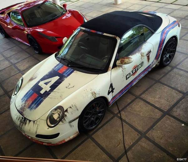 The custom made wrap job, apart from giving off the intended, worn-out look, also features the famous Martini Racing livery that has been on some of the most iconic race cars in history, including the Lancia Delta HF Integrale. The wrap on this Porsche is marked with the distinctive dark blue, light blue and red stripes on an off-white background. Apart from the trendy clothes, this particular 911 also has some light modifications including an IPE exhaust system and BBS rims.
