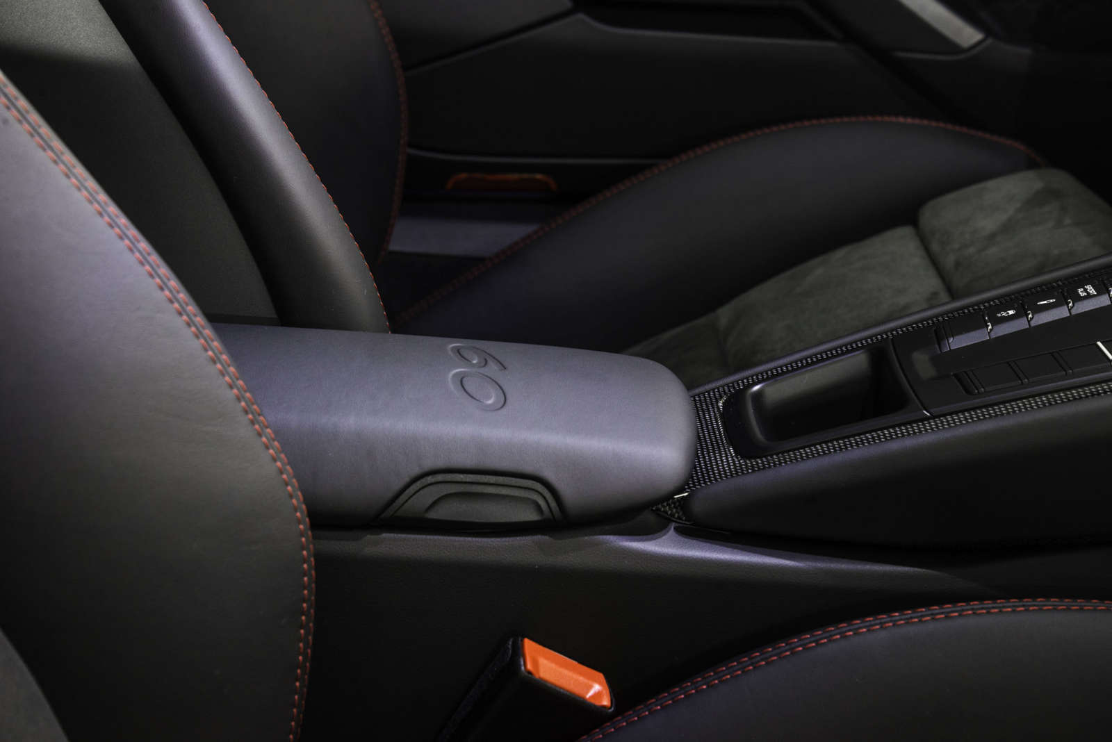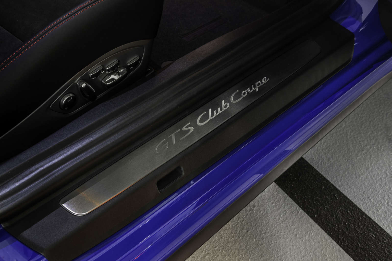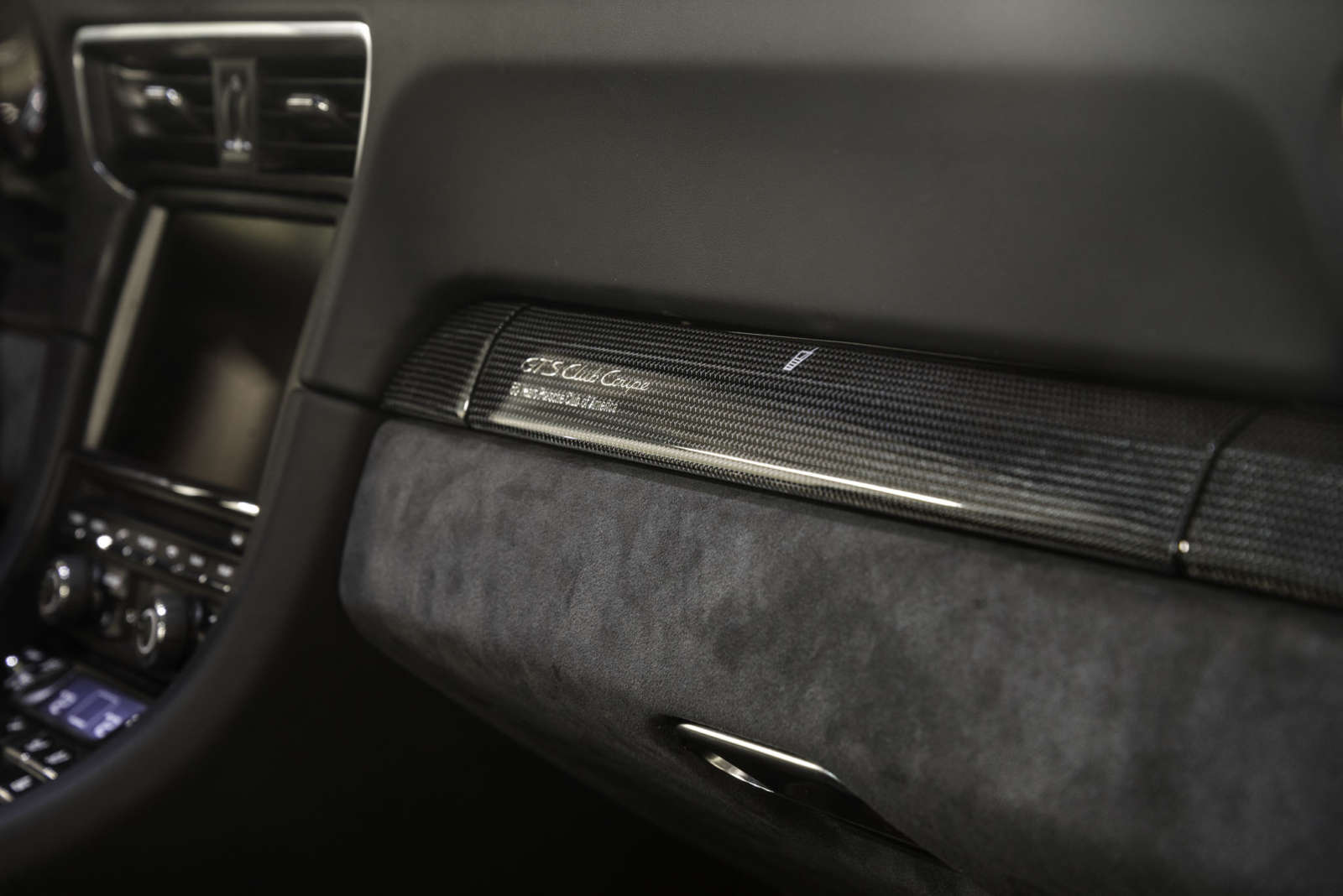 The interior is highlighted by the GTS Interior Package. The stitching, seat belts, and rev counter are held in contrasting Carmine Red, while the dashboard trim strips, door trim and center console are finished in carbon fiber. The steering wheel has a Red 12 o’clock marker and two-tone stitching in Carmine Red and Blue. The center compartment lid is embossed with a “60” and the dashboard trim is personalized with “GTS Club Coupe 60 Years Porsche Club of America” lettering above the glove compartment. Stainless steel door sills which read “GTS Club Coupe” serve as a further distinction.