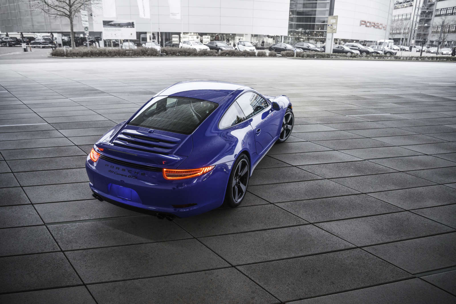 The Porsche 911 GTS Club Coupe features the 44 mm wider body of the 911 Carrera 4 model with a rear wheel drive platform. SportDesign side mirrors, black framed Bi-Xenon™ headlights with Porsche’s Dynamic Light System, and taillights tinted in black. The doors are marked with black “Club Coupe” model designations, painted in the newly created “Club Blau” color, the limited-edition model is also characterized by the SportDesign package, which is fitted as standard. A more pronounced front fascia as well as a “ducktail” rear spoiler gives the special car a striking, yet classic, appearance. 20-inch Sport Classic wheels painted in semi-gloss black with polished wheel centers and rim flanges are also standard on the GTS Club Coupe.