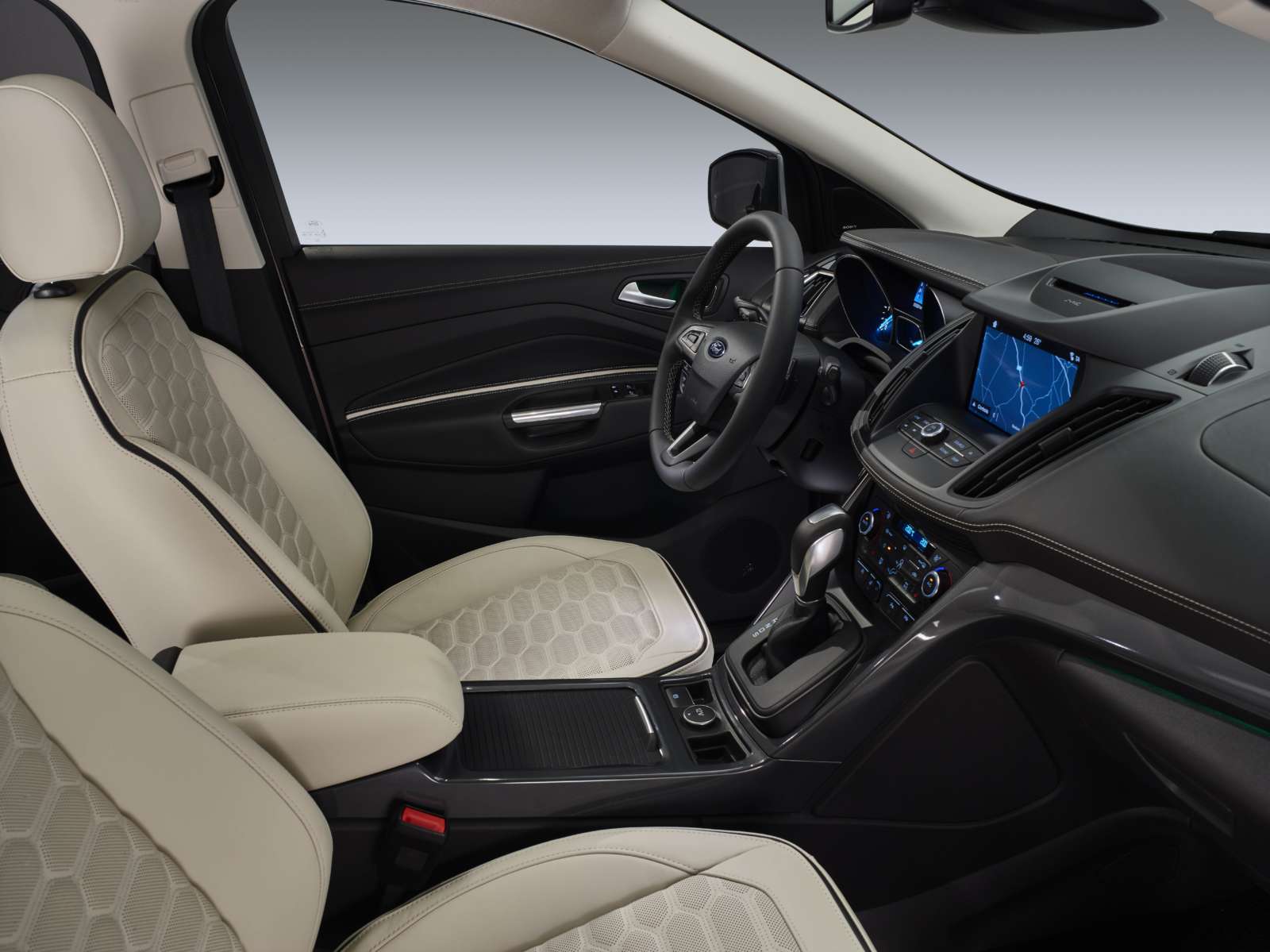 The Kuga Vignale’s interiors feature hexagonal-quilted Windsor leather featuring tuxedo-style stitching for the seats and door interiors, offered in signature Cashmere colour. The leather treatment also extends to the instrument panel. The Kuga Vignale also features the SYNC 3 communication and entertainment system with a redesigned 8‑inch touch screen enabling pinch and swipe gestures for the first time. Then there’s ambient lighting, a premium audio system, tri-zone climate control and a full-length opening panoramic sunroof.