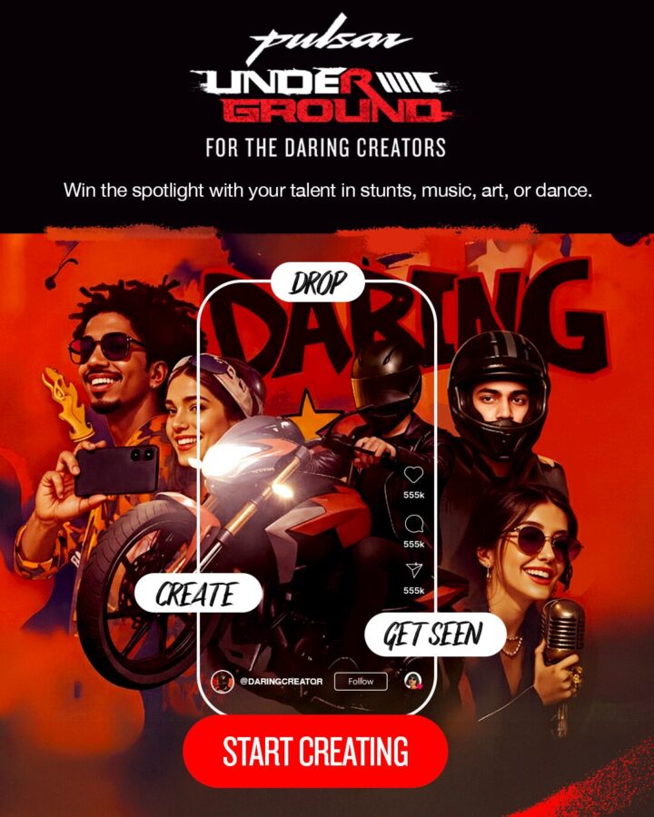 Pulsar Underground is a revolutionary platform for India’s youth, combining creativity, tools, recognition, and opportunities. It inspires creators to express themselves boldly and redefine what it means to be daring, both online and beyond the road.